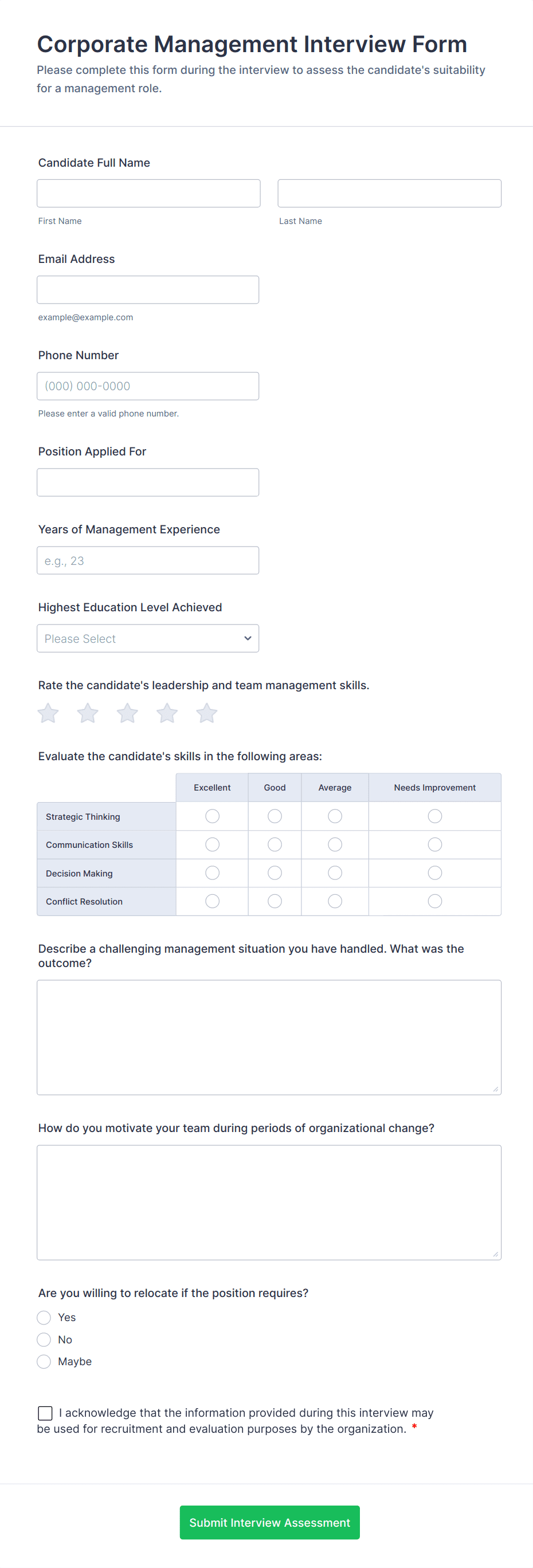 The Remote Job Interview Form helps HR professionals collect essential candidate information for remote interviews, streamlining the hiring process and improving data collection.