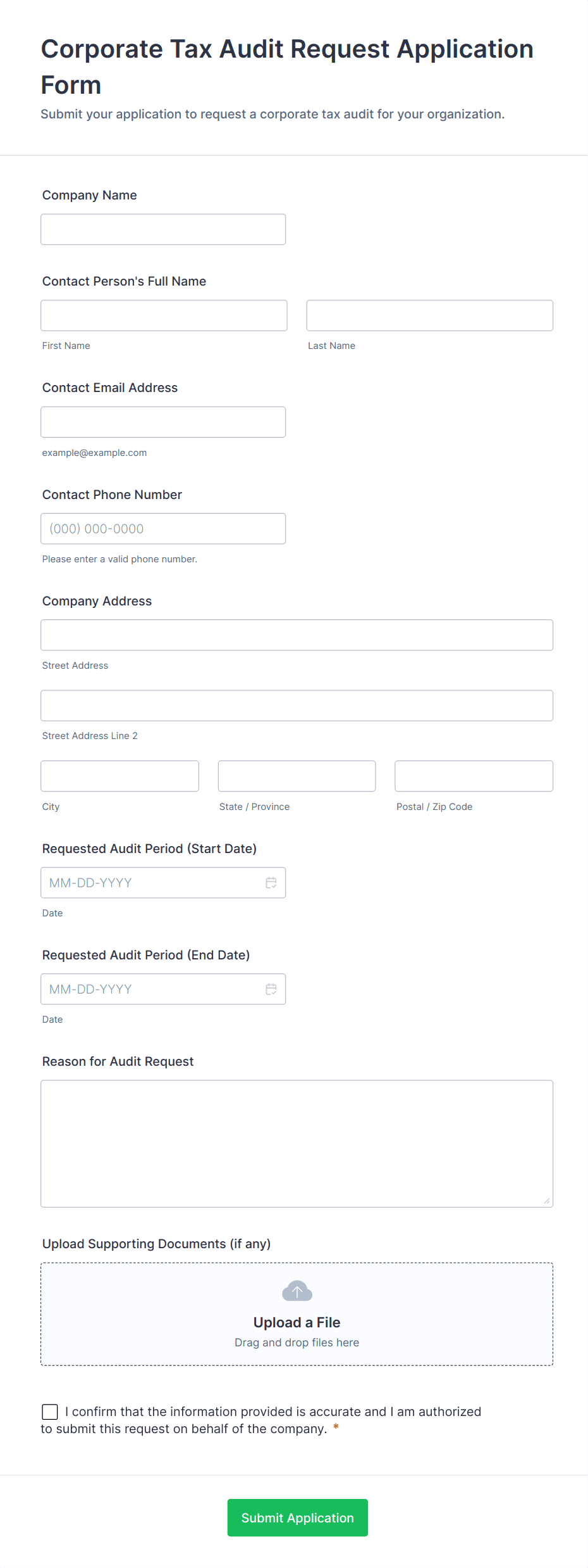 • Compliance Audits: Require fields for regulatory references, evidence collection, and sign-off sections.
