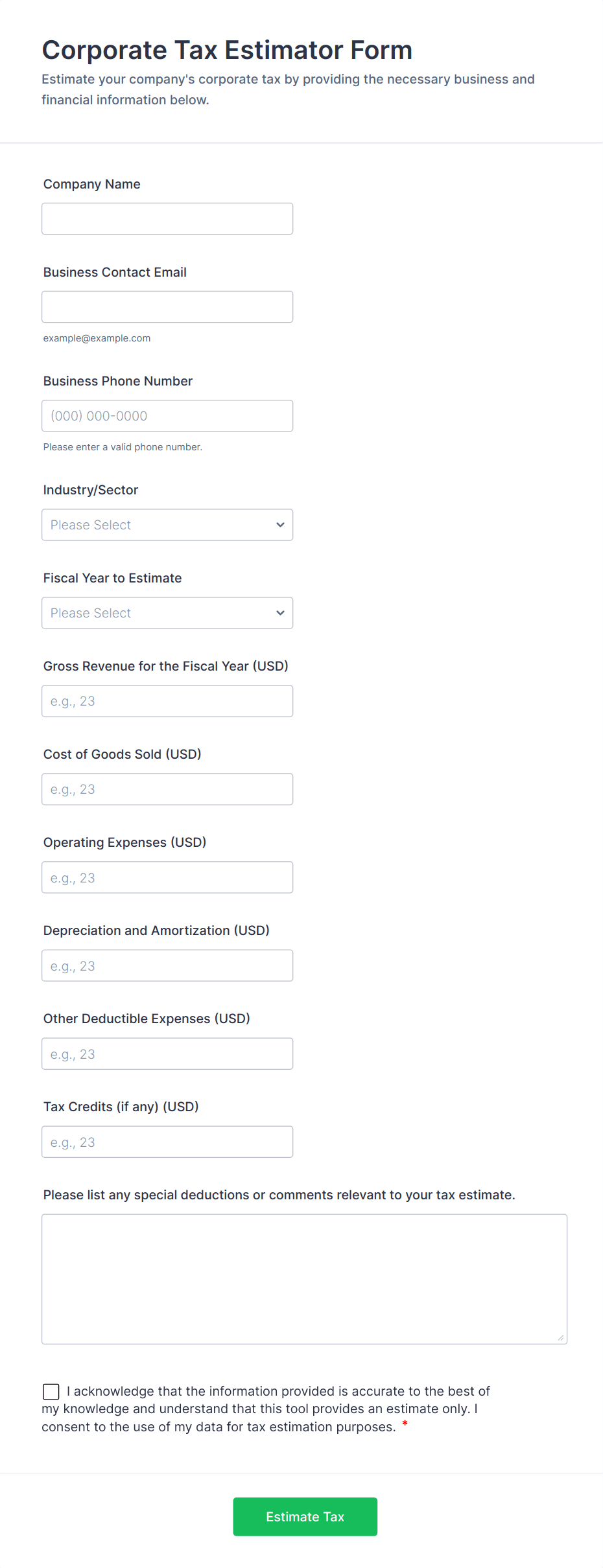 Common fields include personal or business identification details, tax identification numbers, income amounts, deductions, filing status, and supporting documentation such as receipts or invoices.