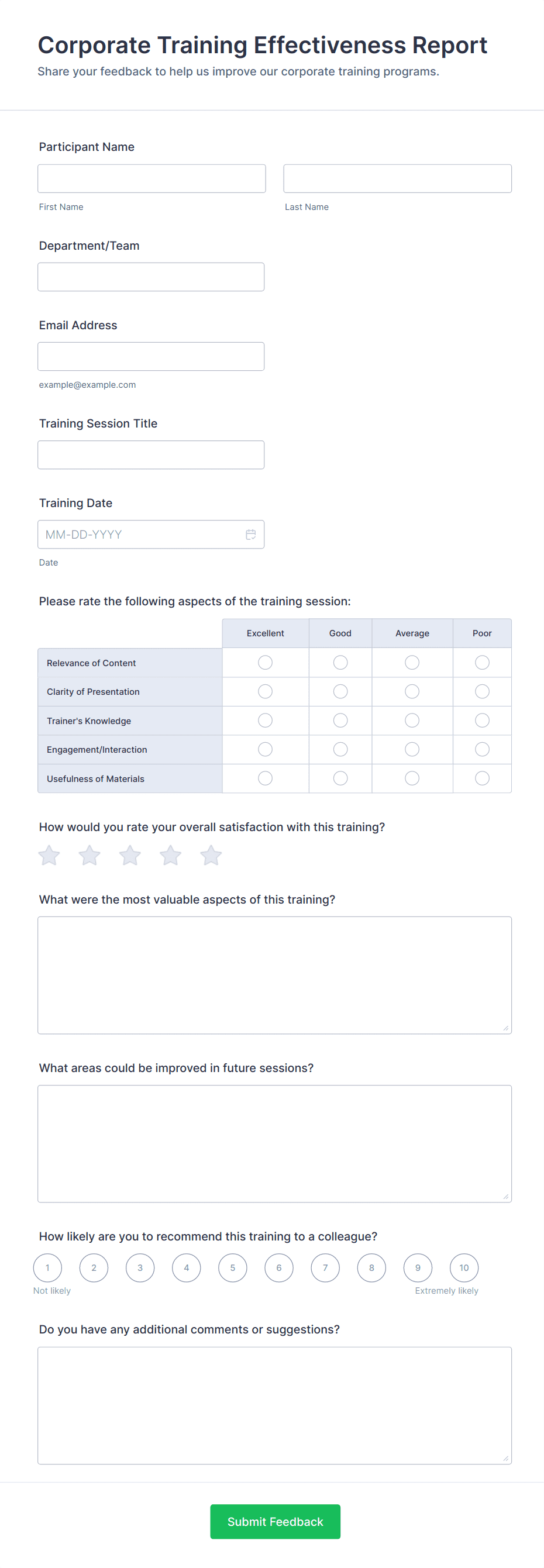 A Training Evaluation Form is a form template designed to collect feedback from trainees and measure their satisfaction with training courses