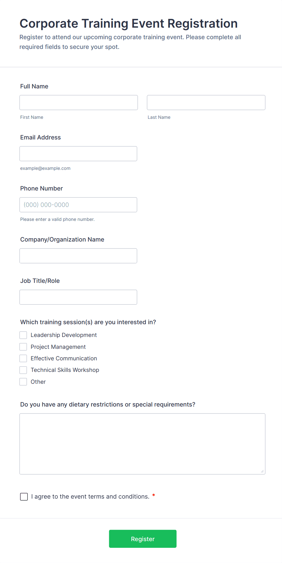 • For speaker or exhibitor forms, add fields for presentation topics, company details, or booth preferences.