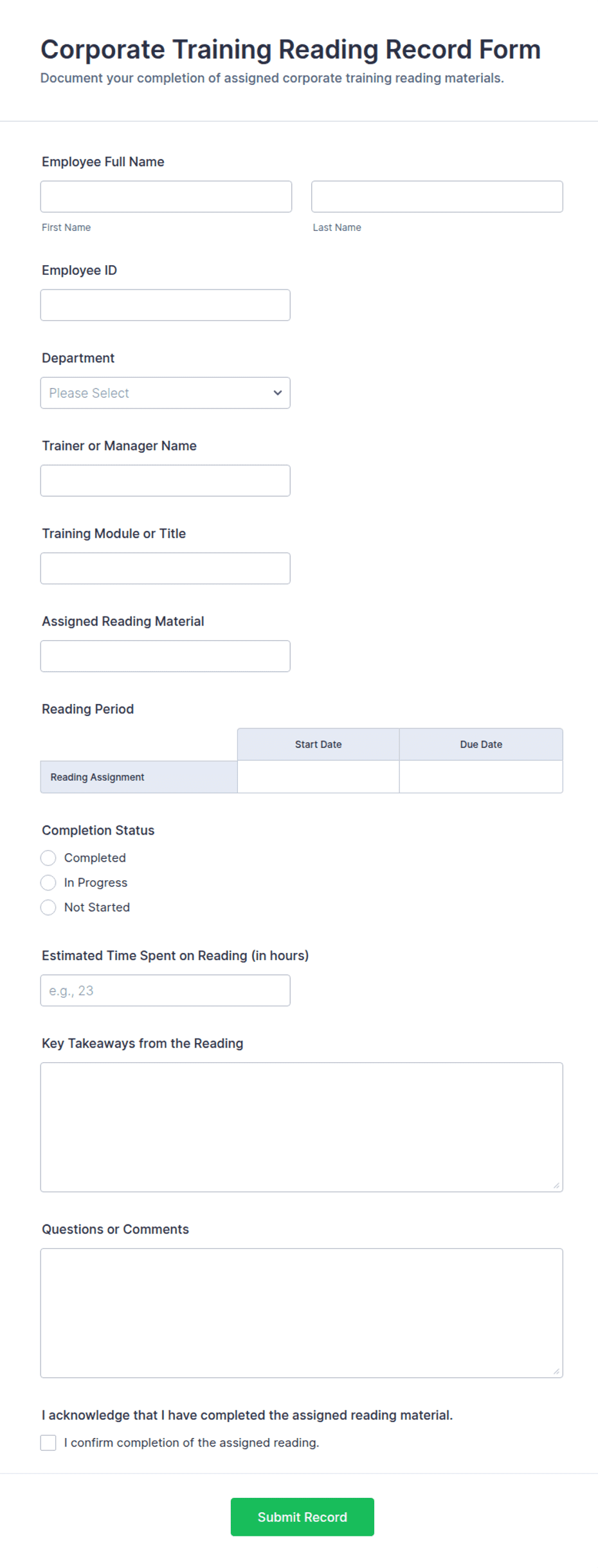Training forms are specialized digital documents designed to streamline the process of organizing, managing, and evaluating training programs. These forms can be used for a variety of purposes, such as employee onboarding, skills assessments, training feedback, course registrations, pre-training surveys, and post-training evaluations. Organizations of all sizes — from corporate HR departments to educational institutions and training consultants — rely on training forms to collect essential information, track participant progress, and ensure that learning objectives are met efficiently.