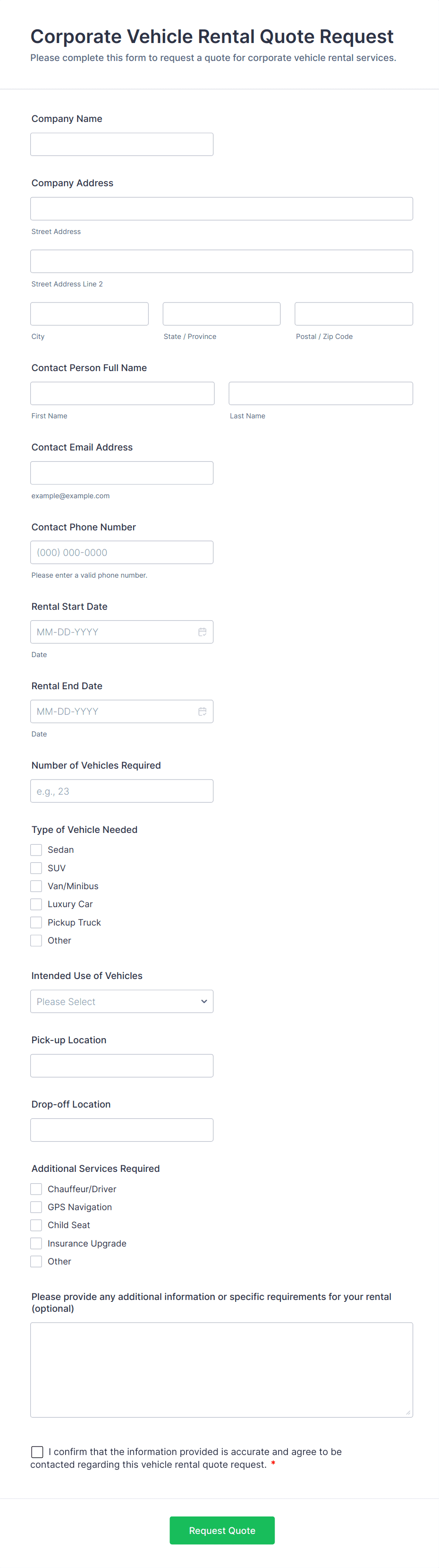 Quote forms are specialized online forms designed to collect information from customers or clients seeking a price estimate for products or services. These forms are commonly used by businesses in industries such as insurance, construction, event planning, logistics, and professional services, where pricing can vary based on specific requirements. By gathering essential details—such as project scope, service preferences, quantities, and contact information—quote forms enable businesses to provide accurate, tailored quotes efficiently. They streamline the initial inquiry process, reduce back-and-forth communication, and help both parties set clear expectations from the outset.