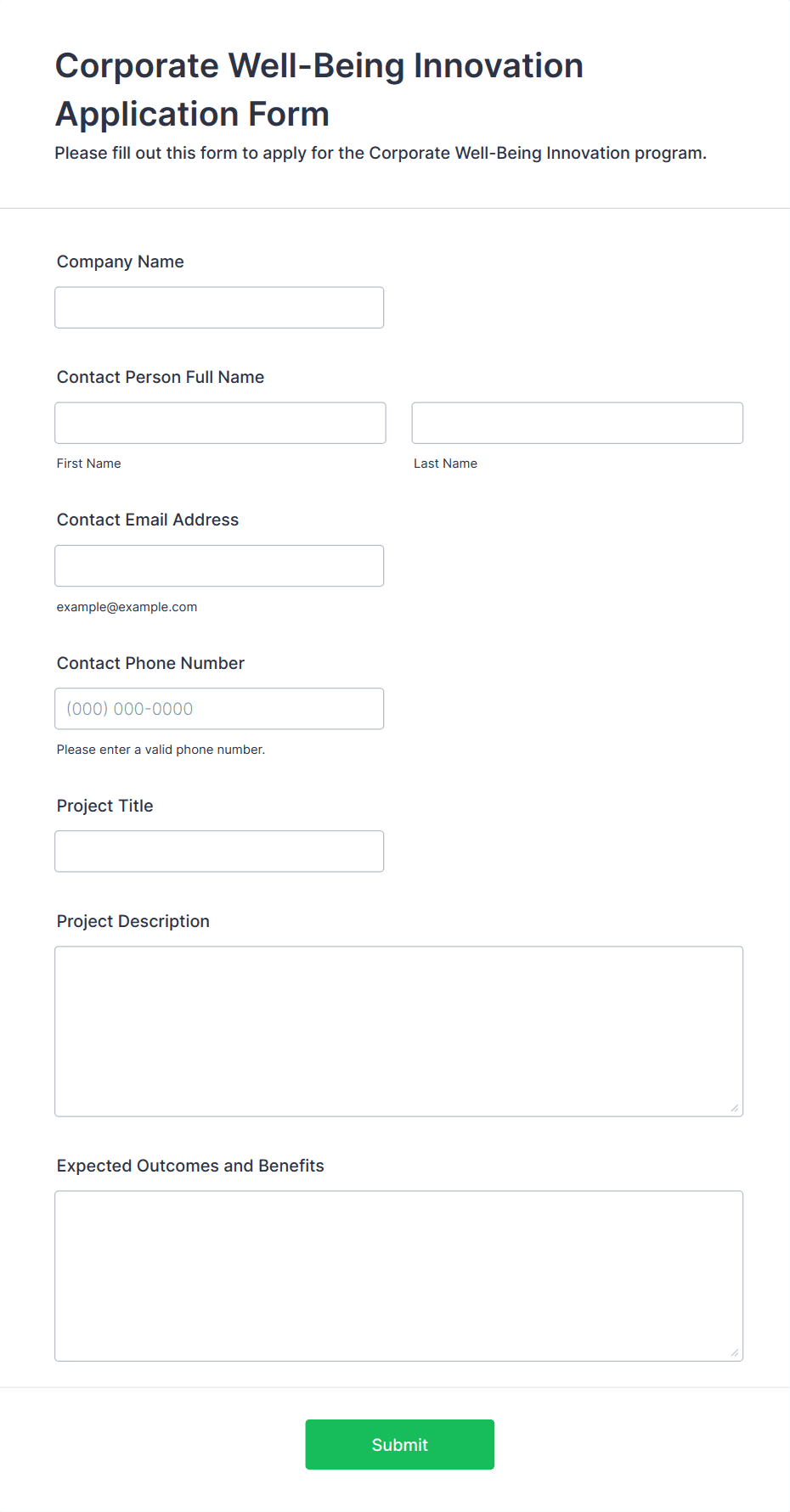 Wellness forms are digital tools designed to collect, track, and manage information related to personal health, well-being, and lifestyle habits. These forms are commonly used by wellness coaches, fitness trainers, healthcare providers, corporate wellness programs, and individuals to monitor aspects such as nutrition, exercise routines, mental health status, sleep patterns, and stress levels. Wellness forms can serve a variety of purposes, including health assessments, daily check-ins, goal tracking, consent collection, and feedback gathering. Their flexibility makes them suitable for use in gyms, clinics, schools, workplaces, and wellness retreats, helping both professionals and individuals stay informed and proactive about health and wellness.