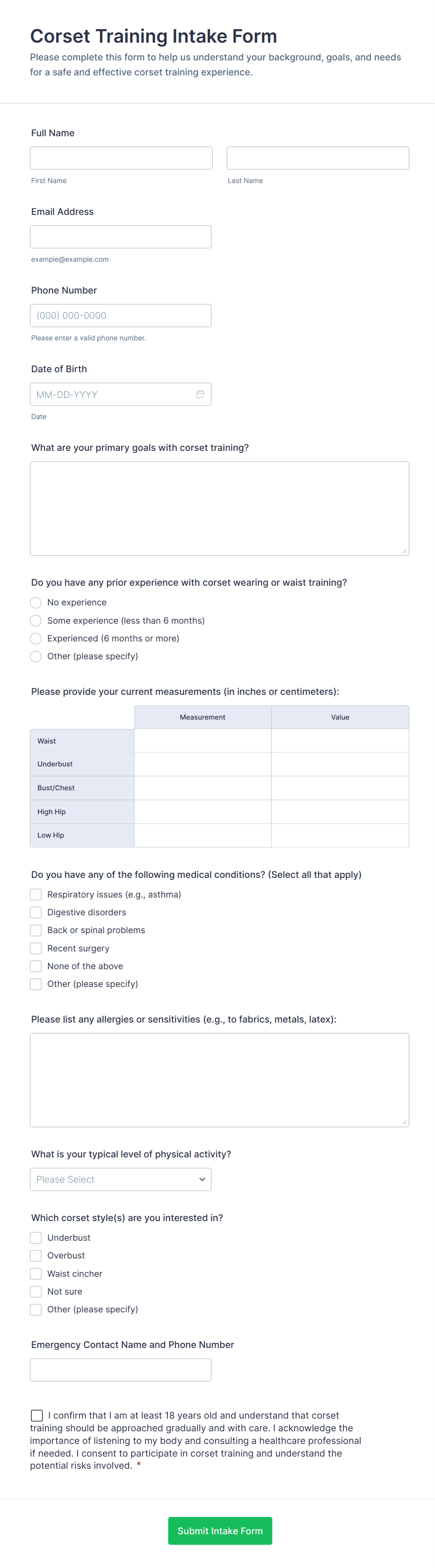 Intake forms are essential tools used to gather preliminary information from clients, patients, customers, or participants before providing a service or beginning a process. These forms streamline the onboarding process by collecting relevant details such as contact information, background data, preferences, and specific needs. Intake forms are widely used across various industries, including healthcare (patient intake), legal (client intake), education (student intake), human resources (employee onboarding), and service-based businesses (client consultations). By standardizing the information-gathering process, intake forms help organizations ensure consistency, improve efficiency, and deliver personalized experiences.