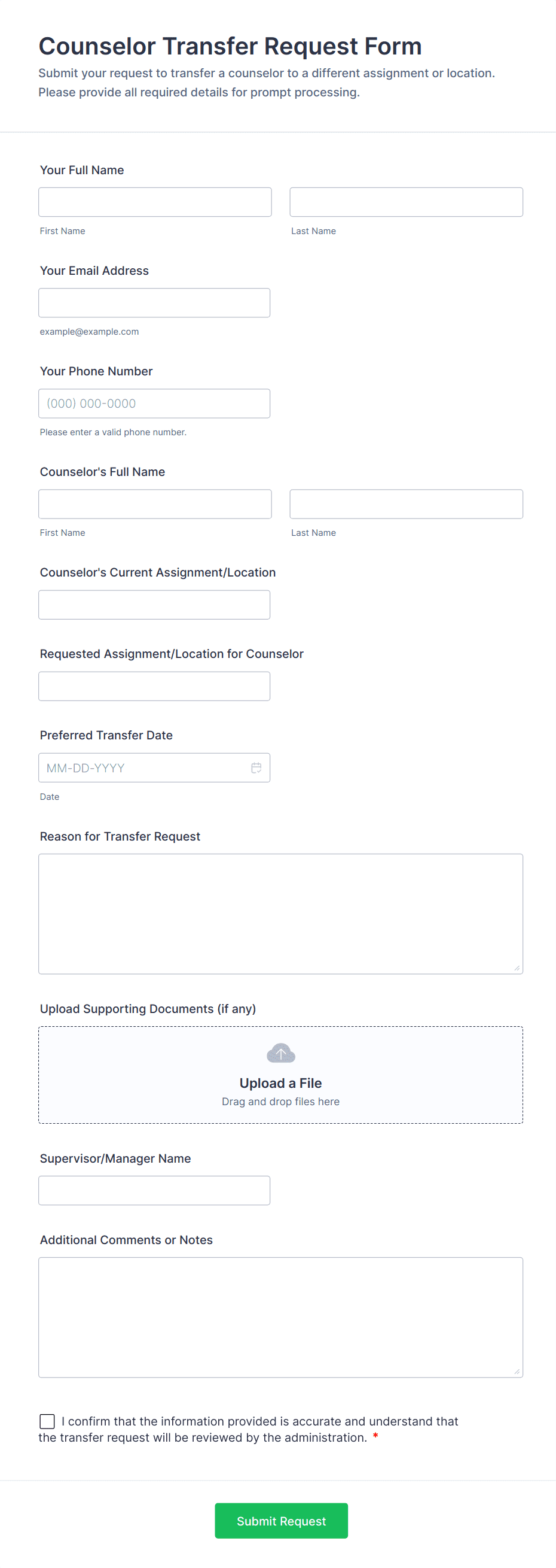 A school counselor form is a digital or paper document used by school counselors to collect, organize, and manage information related to student support, referrals, counseling sessions, and interventions.