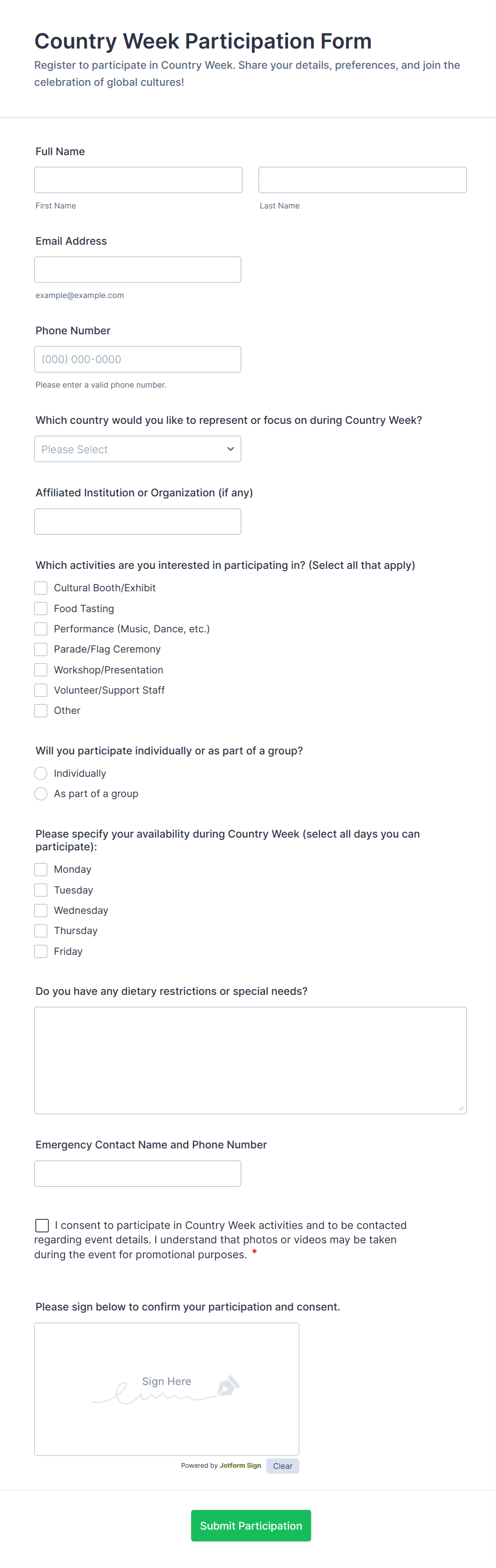 The form templates here are for informational purposes only. Jotform is not providing legal, financial, or other advice, or implying that the forms are legally valid in all or any jurisdictions. Before using any such form, consult an attorney and/or other applicable professionals to make sure that the form meets your needs, legally and otherwise.