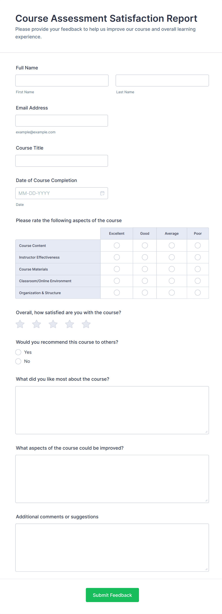 Course Evaluation Forms are essential tools used by educational institutions, training organizations, and instructors to gather feedback from students about a course’s content, delivery, and overall effectiveness. These forms help assess various aspects such as teaching methods, course materials, learning outcomes, and classroom environment. By collecting structured feedback, educators can identify strengths, pinpoint areas for improvement, and make data-driven decisions to enhance future courses. Use cases range from end-of-semester university evaluations and workshop feedback to online training assessments and continuing education reviews.