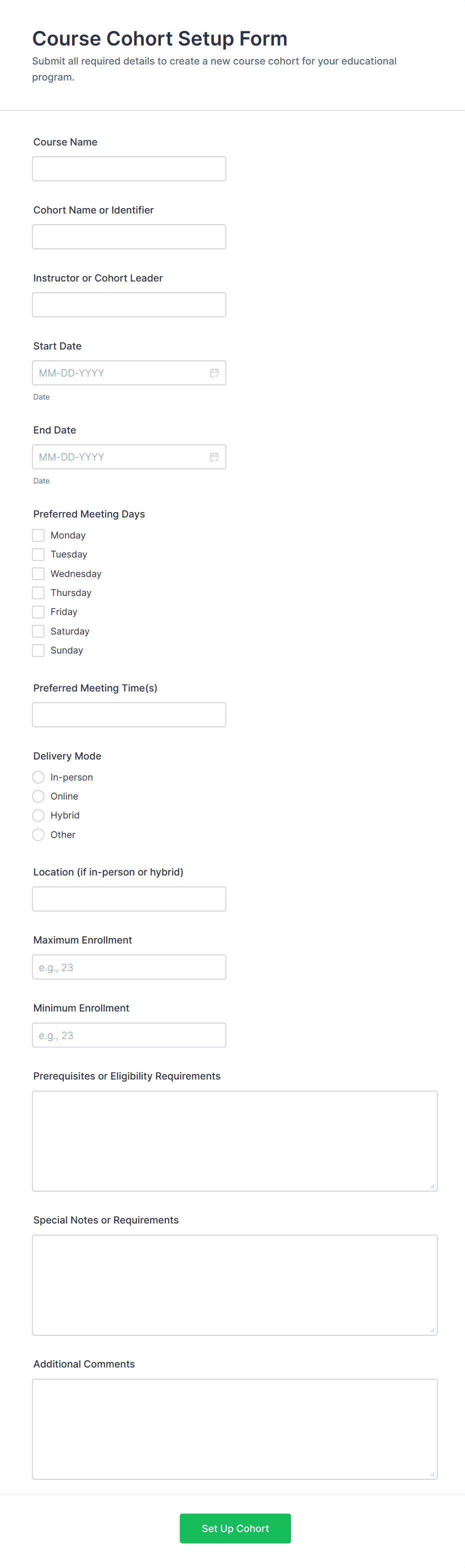 Course Registration Form Templates are specialized online forms designed to streamline the process of enrolling students or participants in educational courses, training sessions, workshops, or seminars. These templates are commonly used by schools, universities, training centers, and independent instructors to collect essential information such as participant details, course preferences, payment information, and prerequisite qualifications. Whether you’re managing a single class or coordinating a multi-session program, course registration forms help automate and organize the intake process, reducing manual paperwork and minimizing errors.