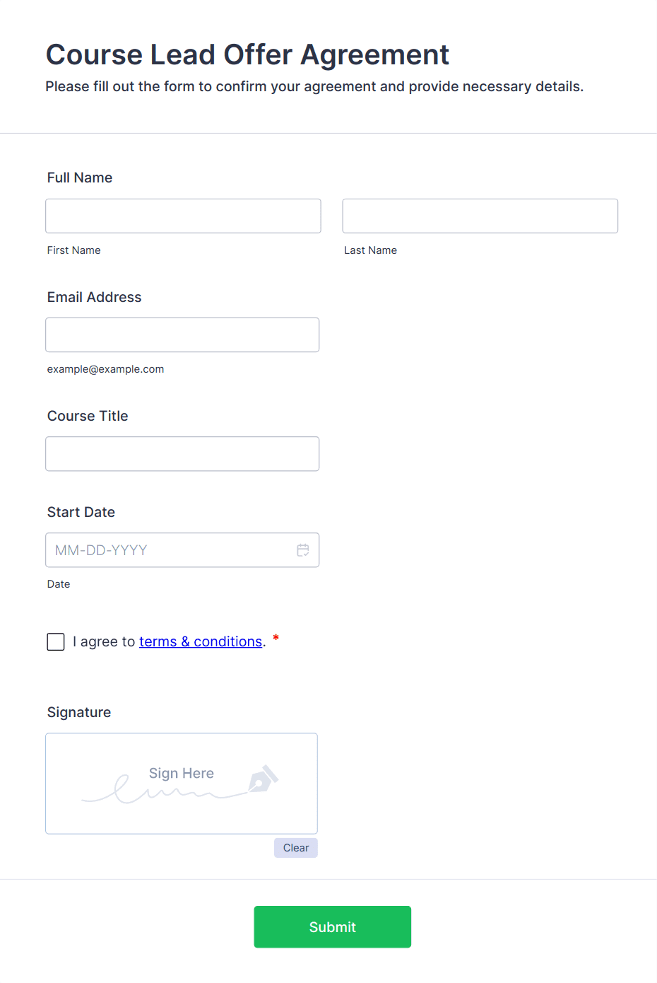 The form templates here are for informational purposes only. Jotform is not providing legal, financial, or other advice, or implying that the forms are legally valid in all or any jurisdictions. Before using any such form, consult an attorney and/or other applicable professionals to make sure that the form meets your needs, legally and otherwise.