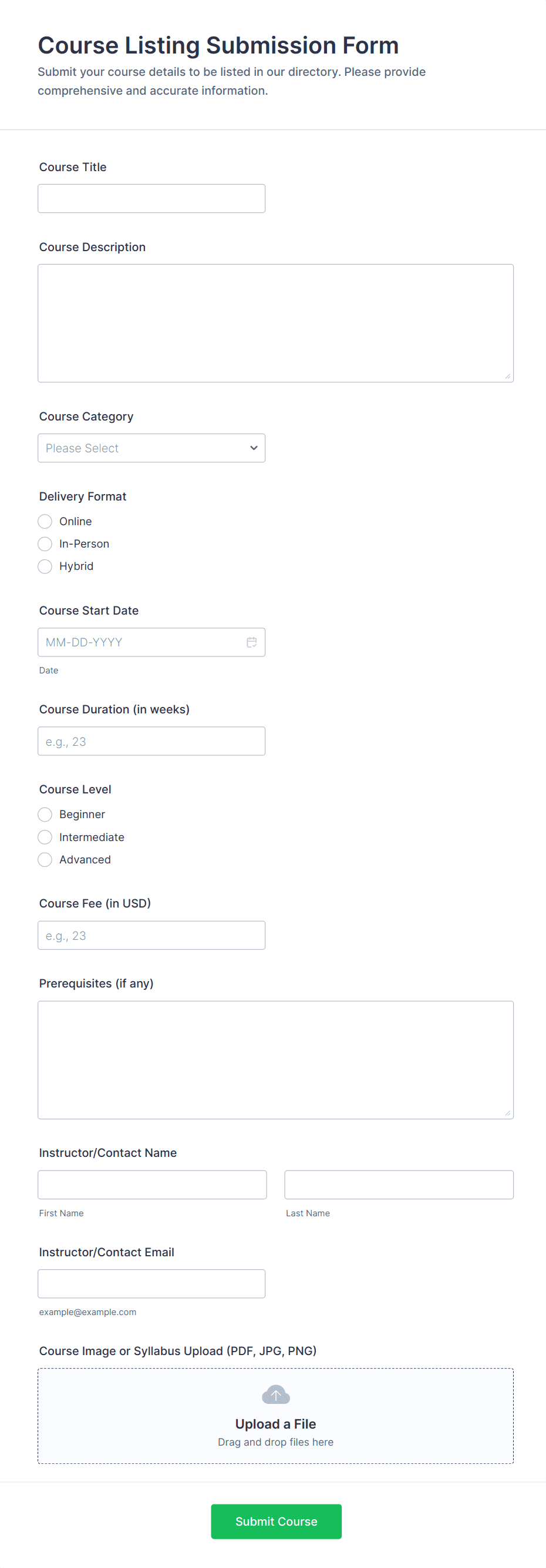 Streamline student registration with the template form providing student contact information, ID and course selection which can be used to arrange classes accordingly. Customize it by adding new fields as your requirements.