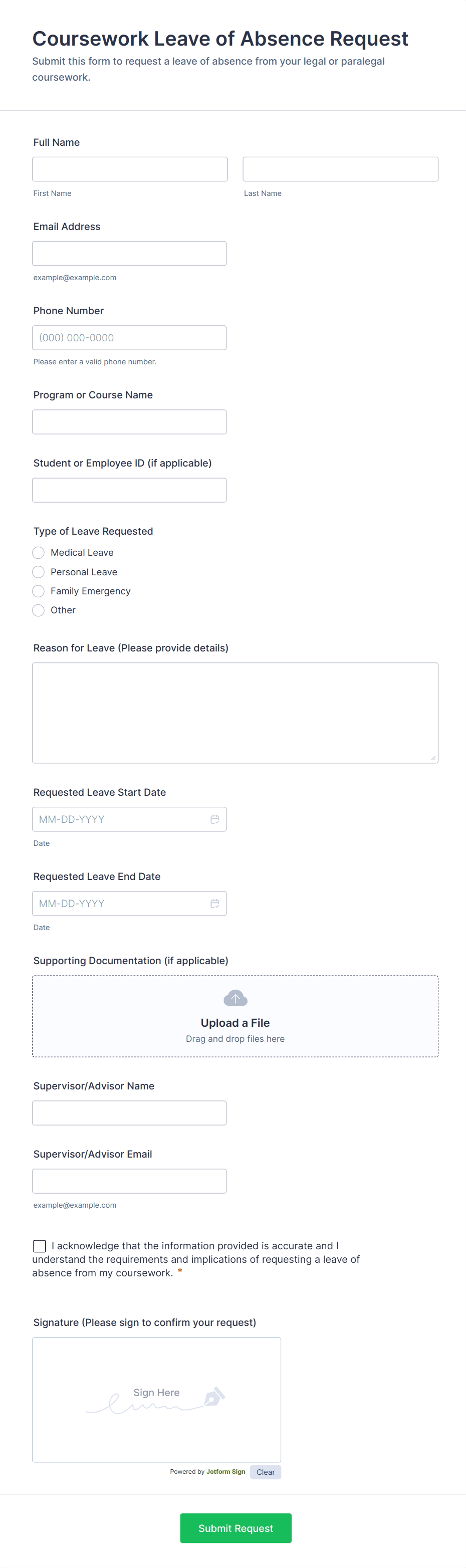 Each leave of absence form should include details like personal contact information, the duration of and reason for the absence, and any supporting documents. In Jotform’s collection of leave of absence form templates, you can find a vacation request form, a school staff leave form, a military leave form, and much more. Simply select the template of your choice and customize it to suit your needs in minutes with our drag-and-drop form builder. Jotform can help you get organized, streamline your workflows, and keep track of employee absences online with our leave of absence form templates.