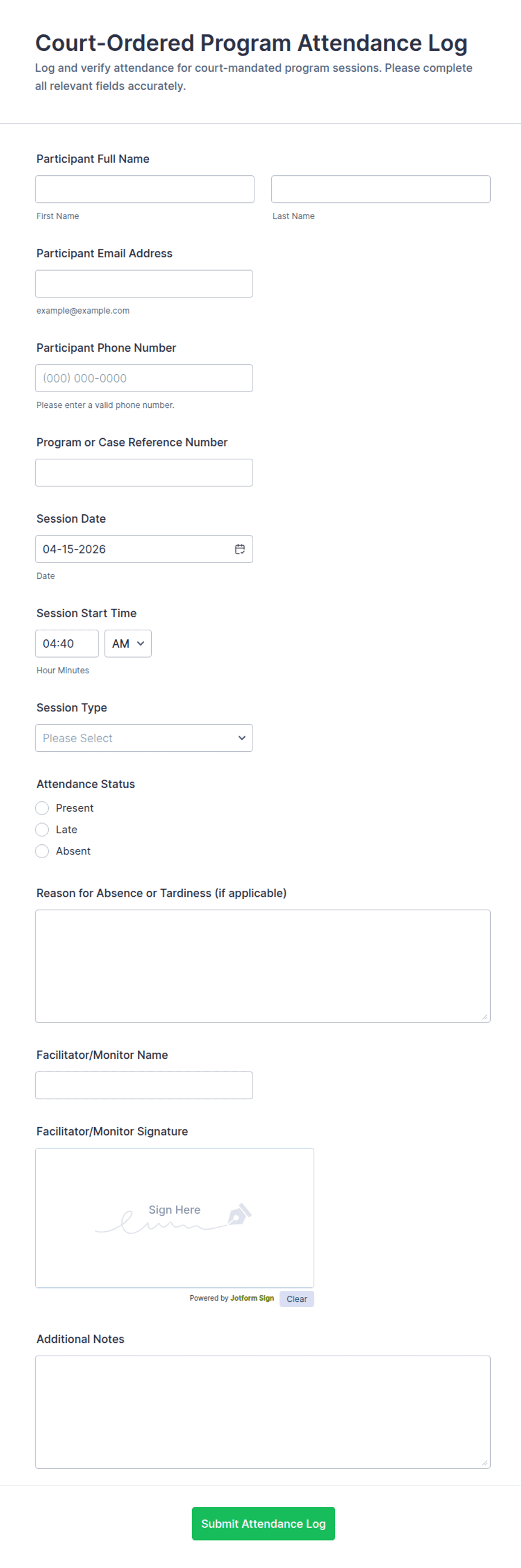 Attendance Form Templates are pre-designed digital forms used to track, record, and manage attendance for a variety of events, activities, and organizations. Whether you’re organizing a classroom, a corporate training session, a community event, or a volunteer program, these templates help streamline the process of collecting participant information and monitoring presence. Attendance forms can be tailored for daily check-ins, event sign-ins, employee time tracking, or even remote attendance verification, making them versatile tools for educators, HR professionals, event coordinators, and team leaders.