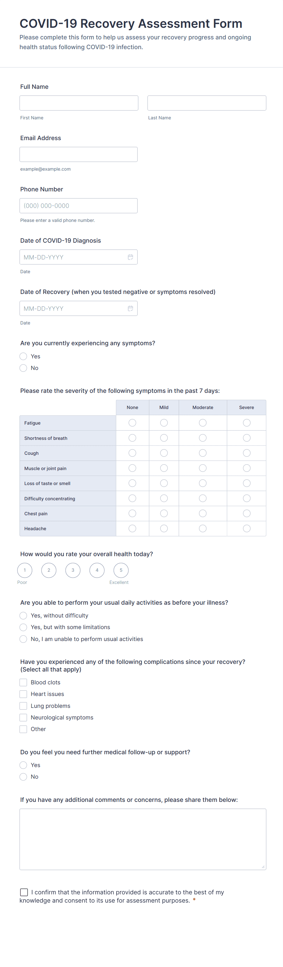 Add fields for symptoms, medical history, medications, allergies, lifestyle factors, and functional status depending on the assessment type. Use rating scales for severity and impact.