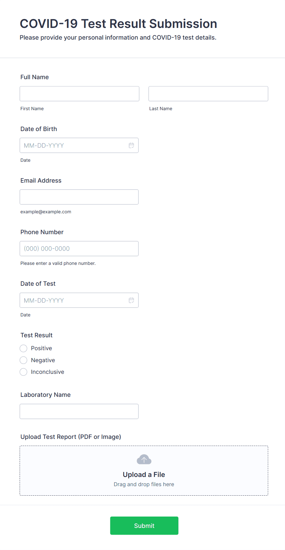 • For test result submissions, include fields for test type, date, result, and file upload for supporting documents.