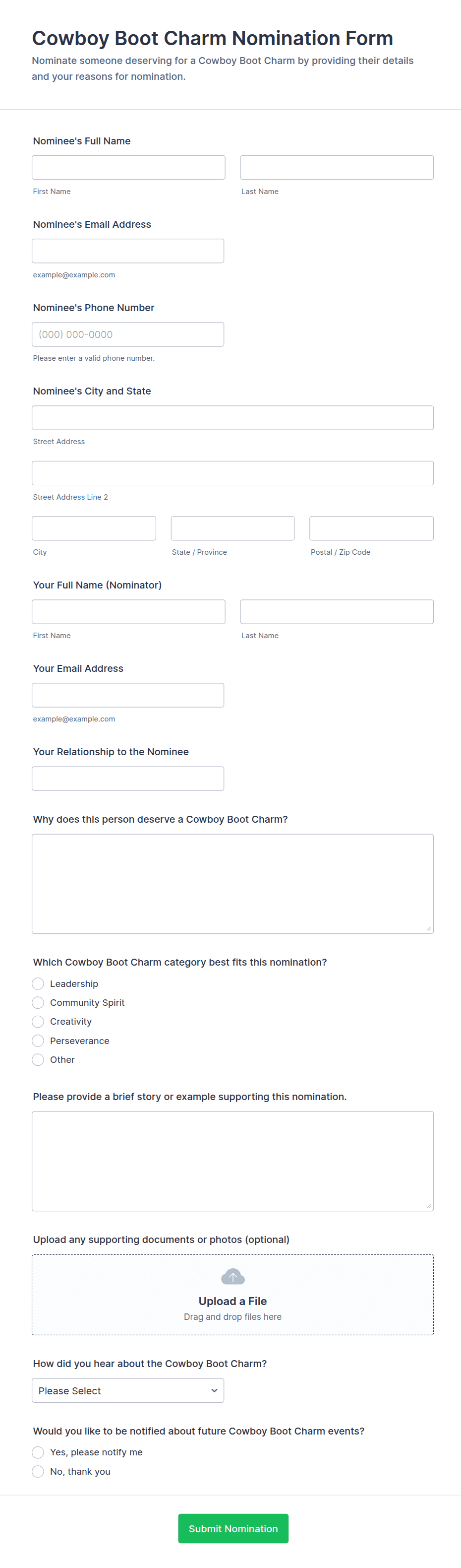 Collect nominee name, role or affiliation, and contact details if needed. Add nominator details and relationship to nominee.