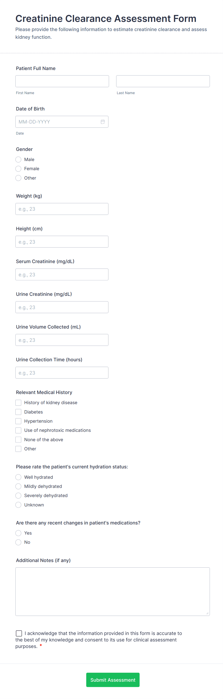 Healthcare assessment forms are structured documents used to collect and evaluate patient health information to support clinical decisions, care planning, and ongoing monitoring. They help healthcare teams capture consistent details about symptoms, medical history, risk factors, functional status, and care needs in a clear and organized way. Healthcare assessment forms are commonly used in clinics, hospitals, telehealth services, rehabilitation centers, home care, and specialty practices for intake assessments, screening evaluations, follow-up check-ins, and condition monitoring. By standardizing assessment workflows, these forms improve documentation quality, reduce missing information, and support safer, more coordinated care.