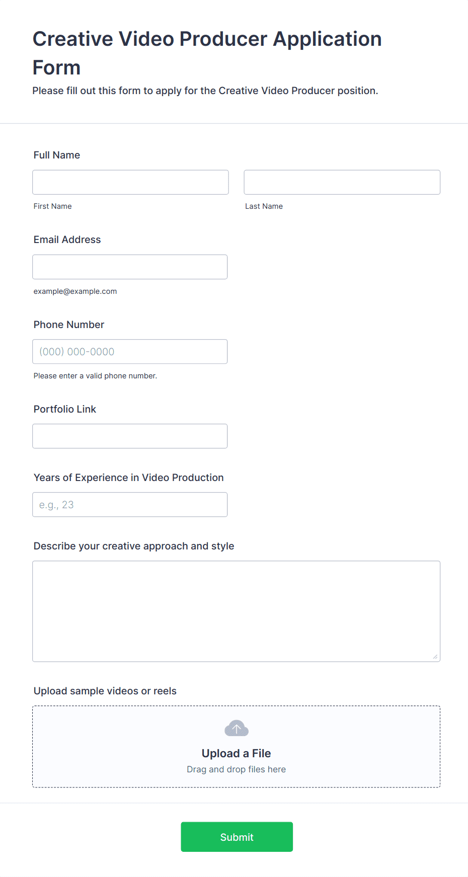 • For job applications, include fields for personal information, education, work experience, references, and file uploads for resumes or cover letters.