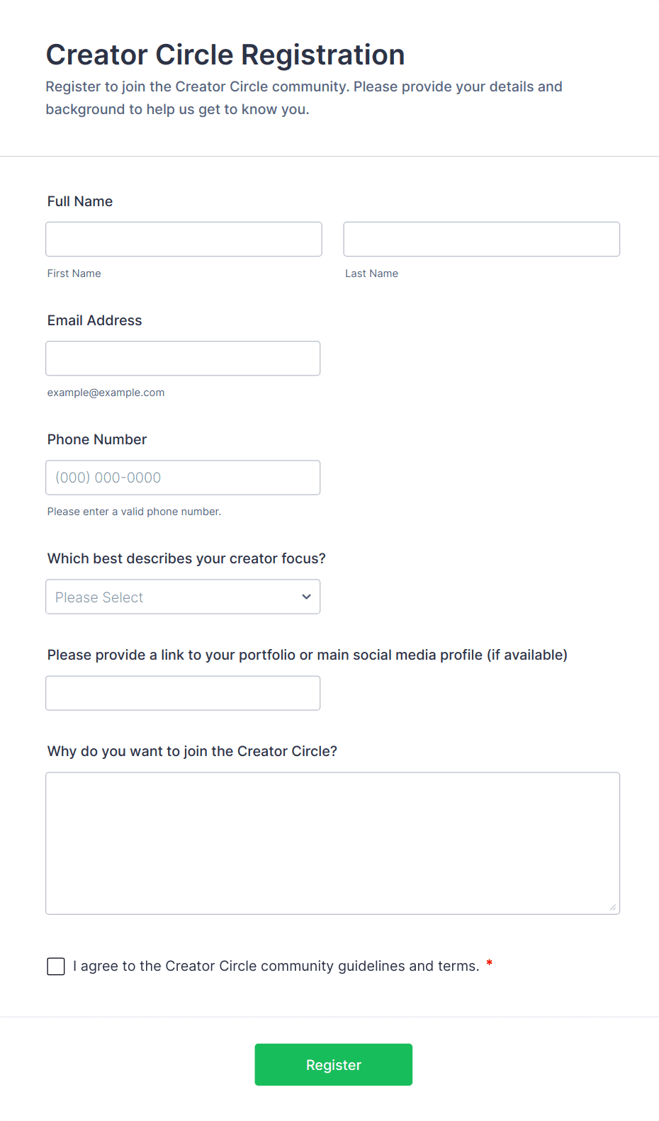 • Newsletter Sign Up: Typically requires only name and email, with optional interest checkboxes.