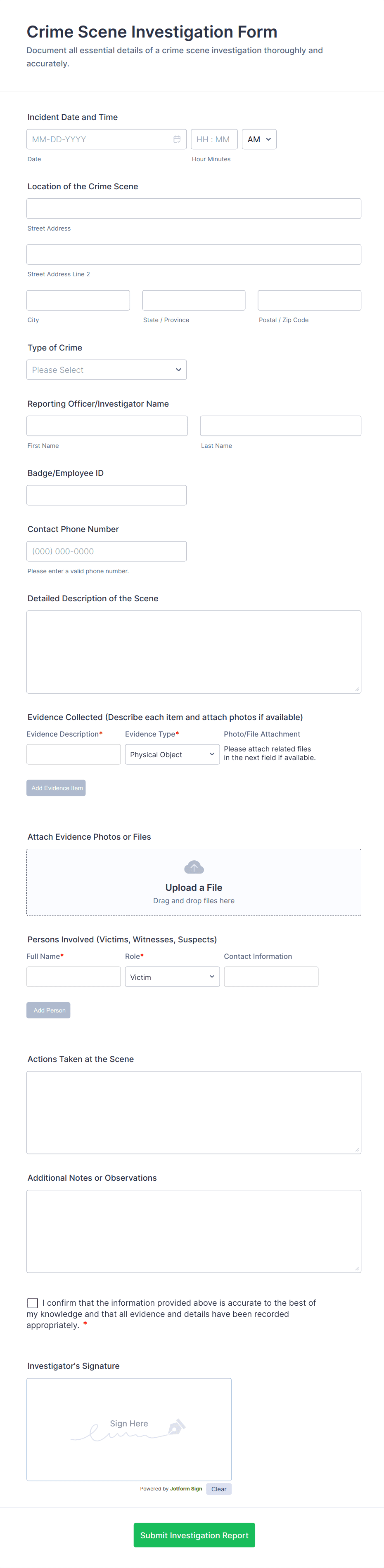 Customize your Incident Report Forms to suit your needs with Jotform’s intuitive no-code builder. Simply drag and drop to include your logo, add or update form fields, include checklist items, change fonts and colors, and more. Connect with our 100+ integrations such as Dropbox, OneDrive, or Airtable to automatically sync your submissions. Form responses are stored in your secure Jotform account and protected with a 256-bit SSL connection, CCPA compliance, PCI compliance, and optional HIPAA compliance.