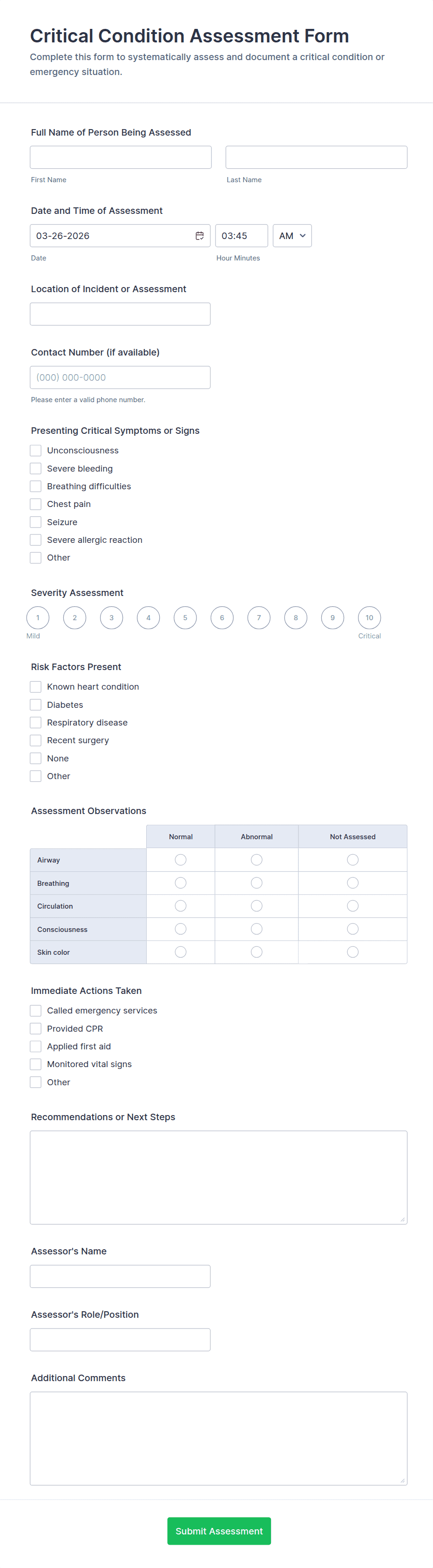 Add fields for symptoms, medical history, medications, allergies, lifestyle factors, and functional status depending on the assessment type. Use rating scales for severity and impact.