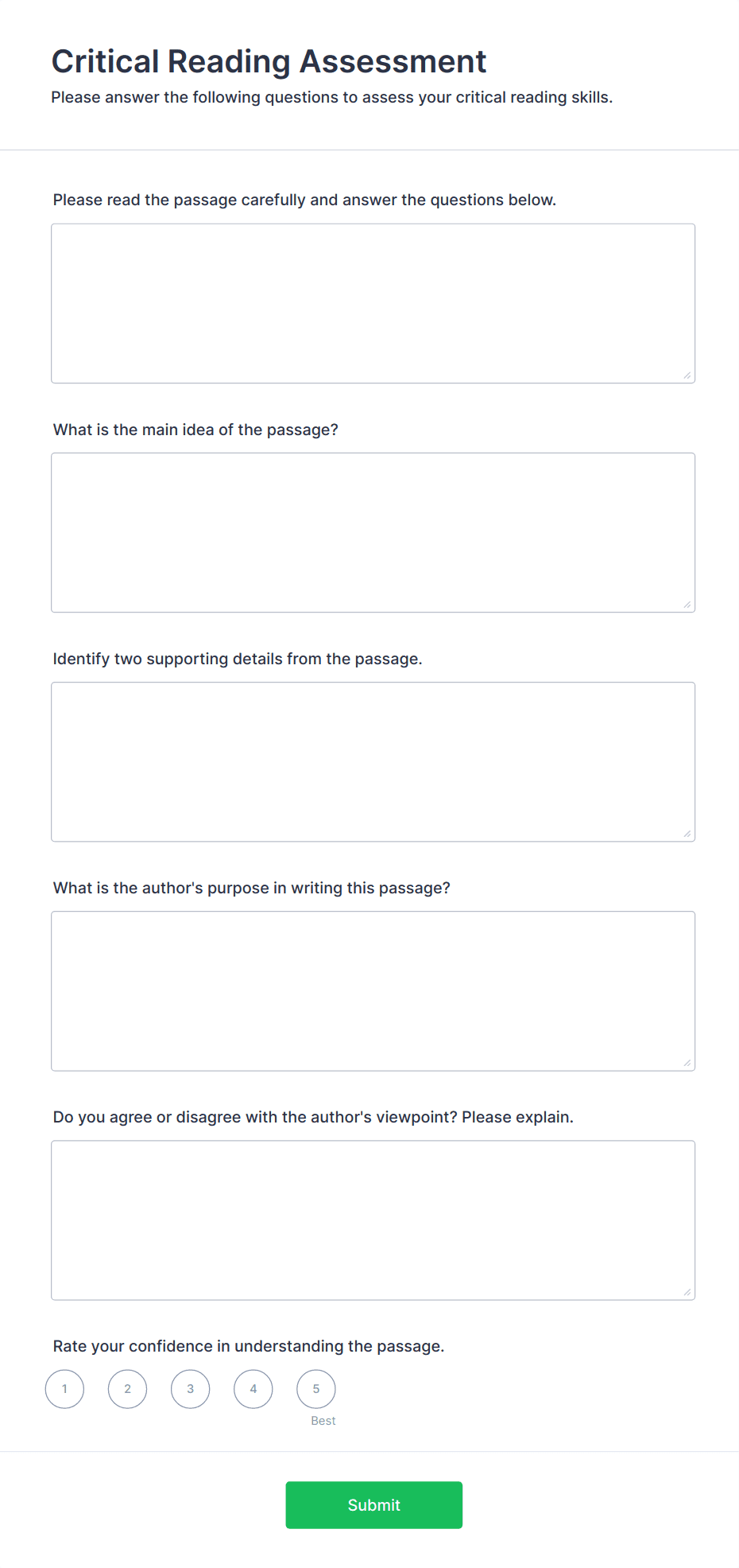 Assessment forms may include personal details, multiple-choice or open-ended questions, rating scales, comment sections, and sometimes automated scoring or feedback fields, depending on the purpose.