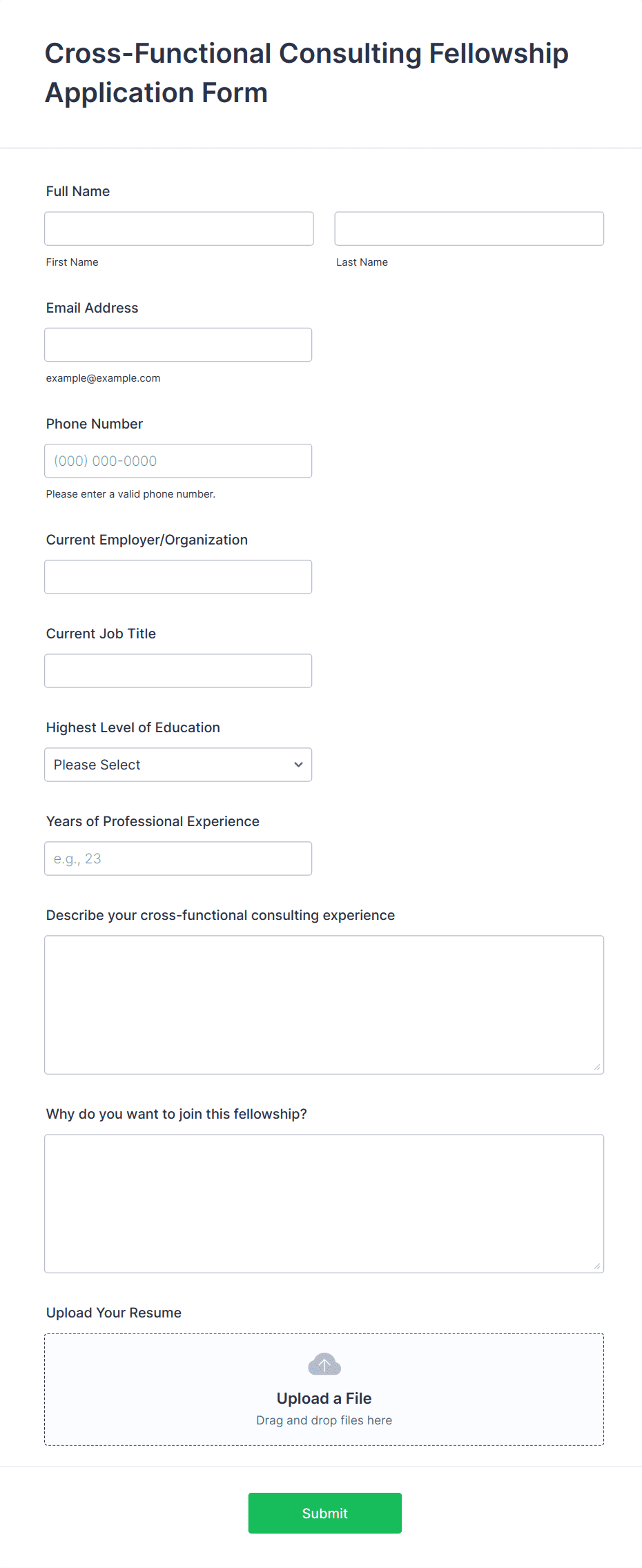 - For job applications, include fields for personal information, education, work experience, references, and file uploads for resumes or cover letters.