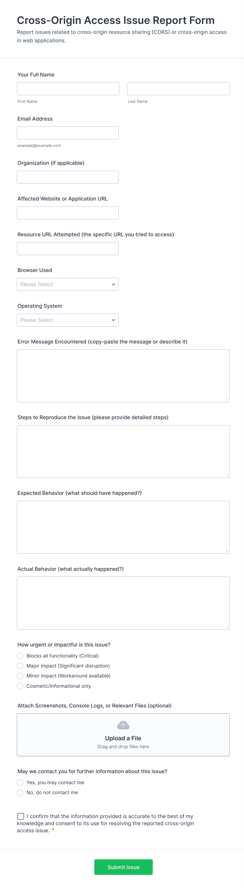 Common fields include requestor details, issue or request description, device or software information, urgency level, and supporting documentation.