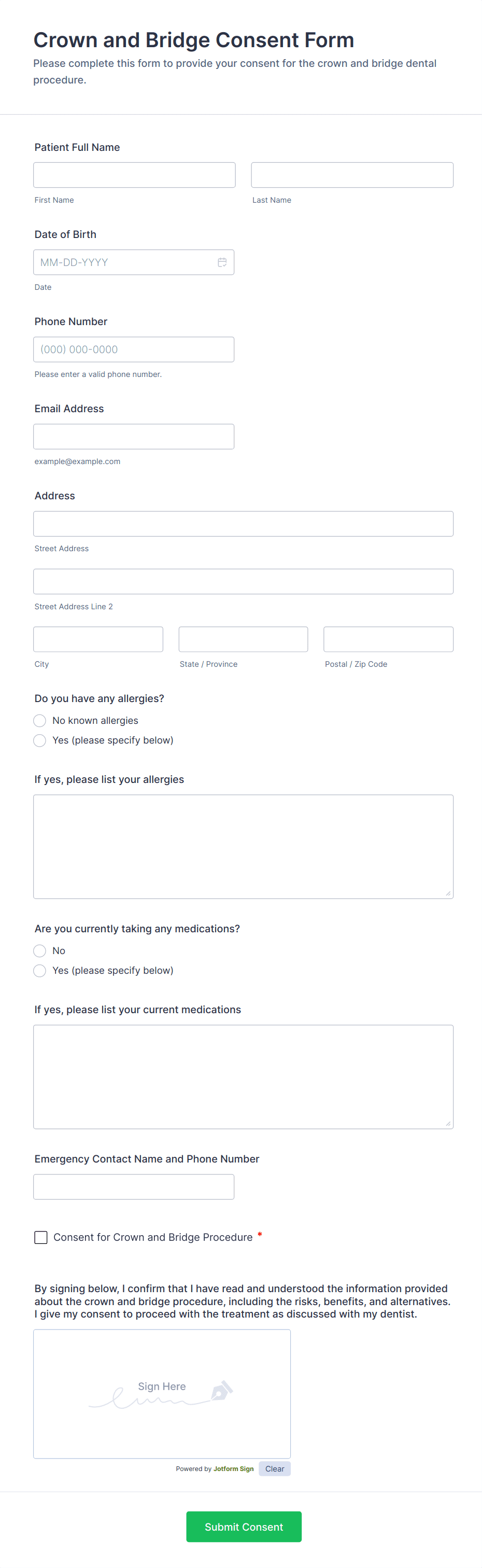 Collect patient consent for crown and bridge treatment with the Crown and Bridge Consent Form, helping dental teams gather key pre-treatment details, capture signatures, and organize data collection in Jotform.