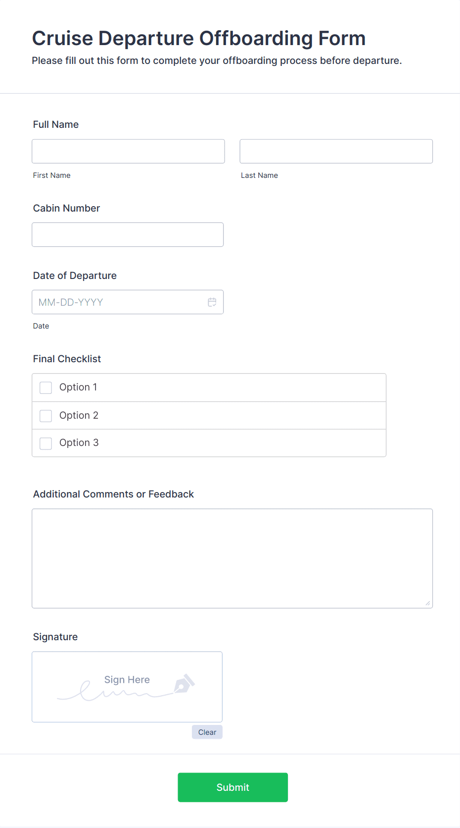 The form templates here are for informational purposes only. Jotform is not providing legal, financial, or other advice, or implying that the forms are legally valid in all or any jurisdictions. Before using any such form, consult an attorney and/or other applicable professionals to make sure that the form meets your needs, legally and otherwise.