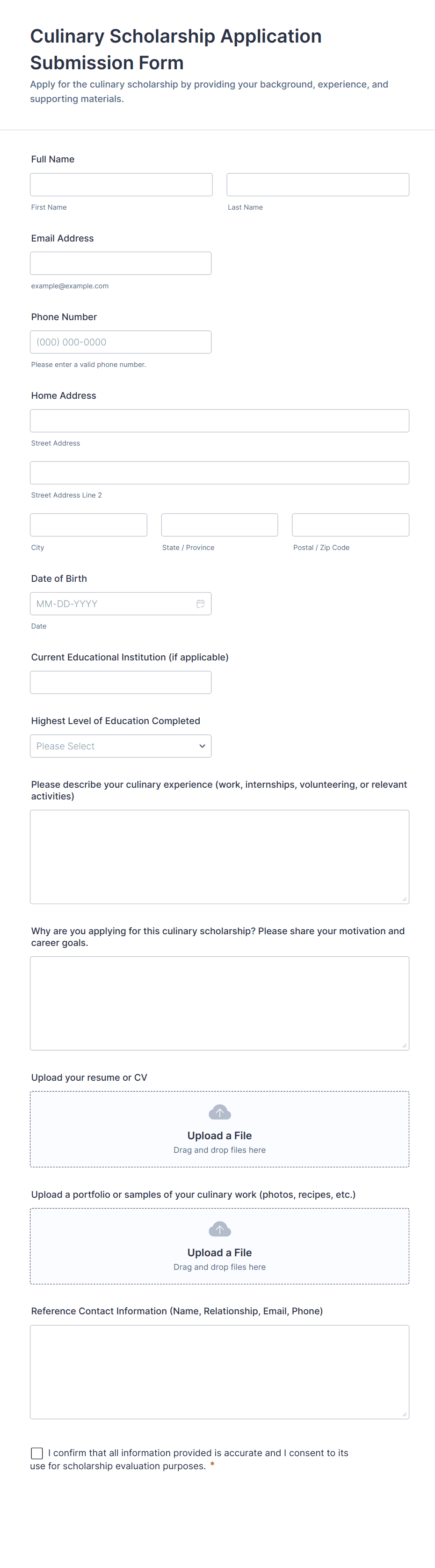 Scholarship application forms are essential tools for students seeking financial assistance to support their educational pursuits. These forms are used by educational institutions, nonprofit organizations, foundations, and government agencies to collect detailed information from applicants, such as academic achievements, financial need, extracurricular involvement, and personal statements. Scholarship application forms streamline the process of evaluating candidates, ensuring that all necessary data is gathered in a standardized and organized manner. Use cases range from undergraduate and graduate scholarship programs to specialized awards for athletics, arts, or community service, as well as grants for specific demographics or fields of study.
