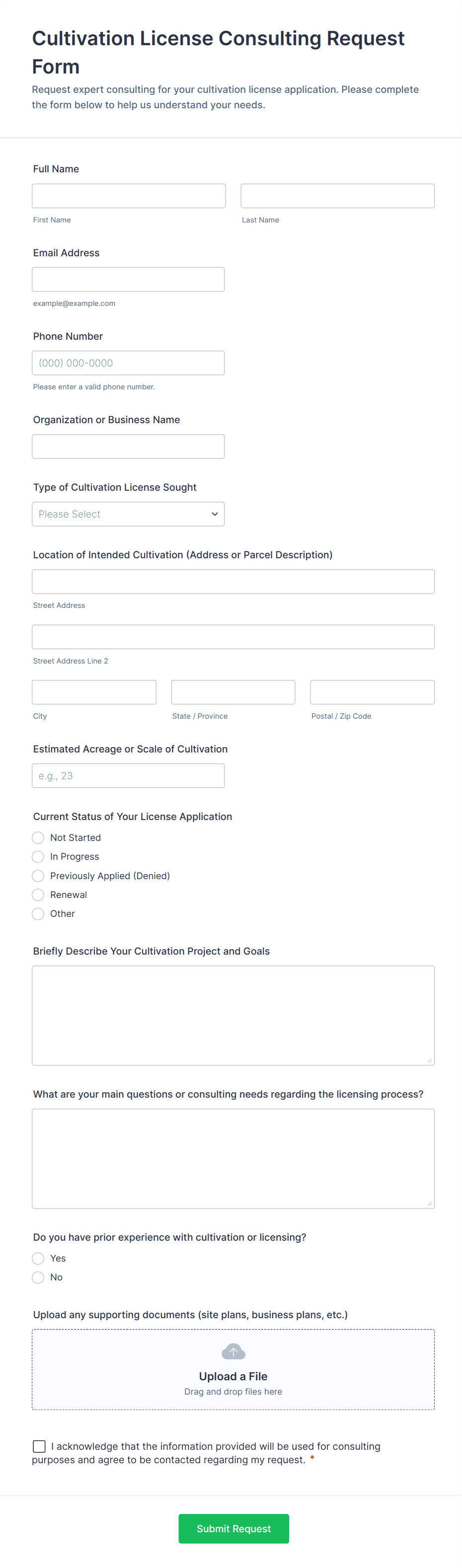 Consulting forms are specialized digital documents designed to streamline the information-gathering and communication processes between consultants and their clients. These forms can be used for a variety of purposes, such as client intake, needs assessments, project proposals, feedback collection, appointment scheduling, and progress tracking. Consulting forms help consultants efficiently collect essential details, clarify project scopes, set expectations, and document agreements, making them invaluable tools for independent consultants, consulting firms, and agencies across industries like business, IT, HR, marketing, and more.
