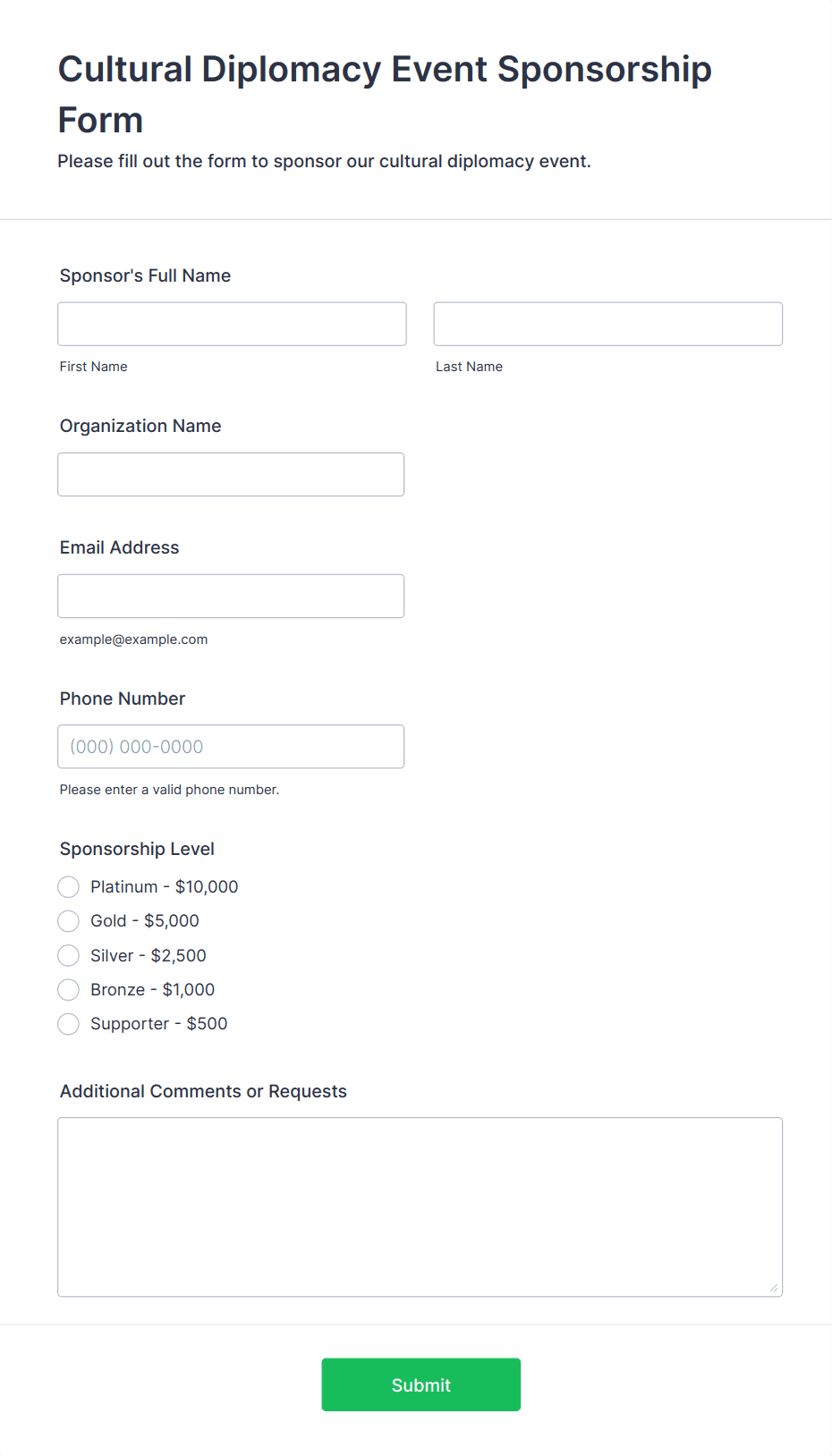 An Event Sponsorship Form is a form template designed to help event organizers and businesses secure financial support for their events.