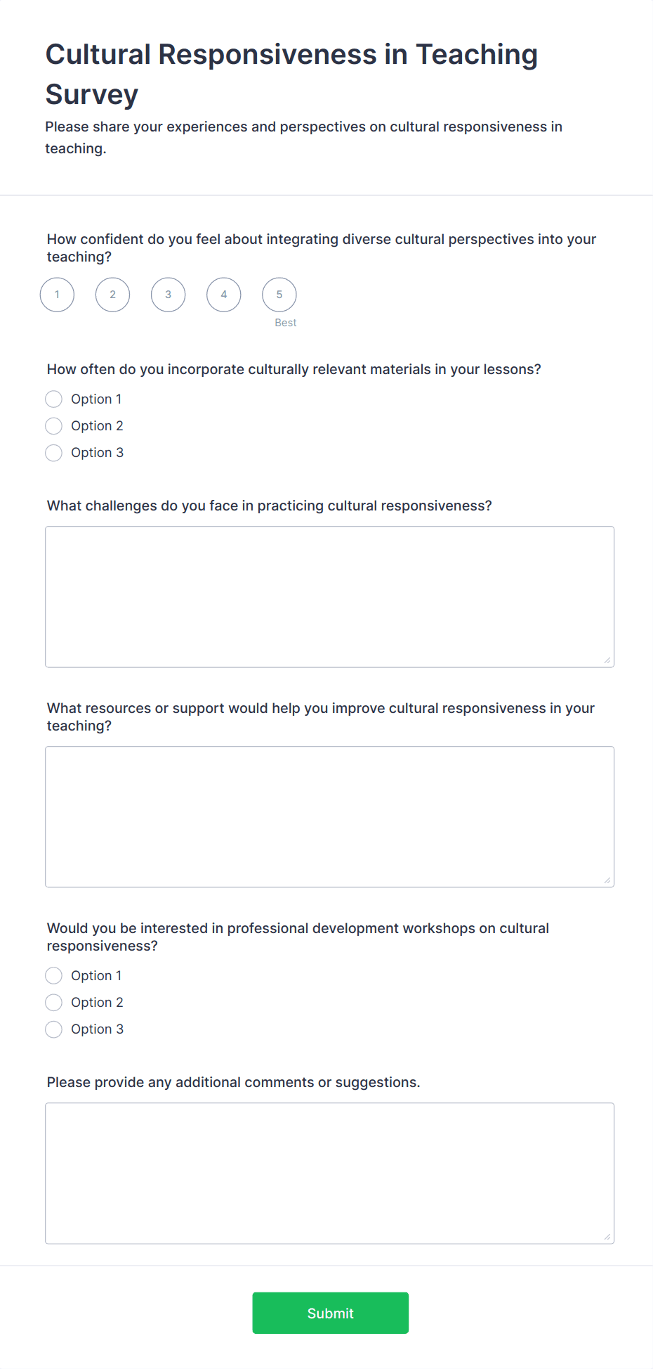 • For teacher or staff surveys: Include self-assessment fields, peer review sections, and narrative response options.