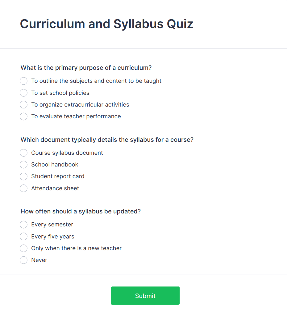 Test your students on what they know with our free online Multiple Choice Test Template! Just add your test’s questions and answers to this template, embed the test on your website or email a link to students, and start accepting submissions instantly.