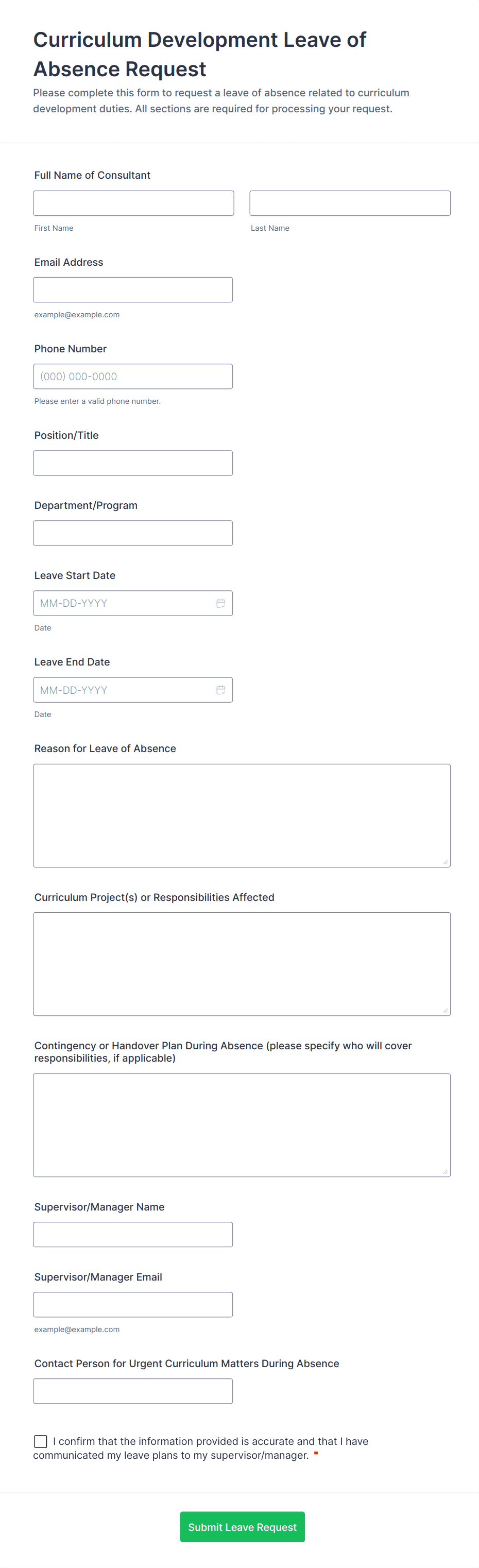 Leave Request Form Templates are digital forms designed to streamline the process of requesting and managing employee absences within organizations. These templates are commonly used by HR departments, team leaders, and managers to collect essential information from employees who need to take time off for reasons such as vacation, sick leave, personal days, parental leave, or other special circumstances. By standardizing the leave request process, these forms help ensure that all necessary details—such as dates, type of leave, reason for absence, and approval status—are captured efficiently and consistently. Use cases range from small businesses tracking vacation days to large enterprises managing complex leave policies across multiple departments.