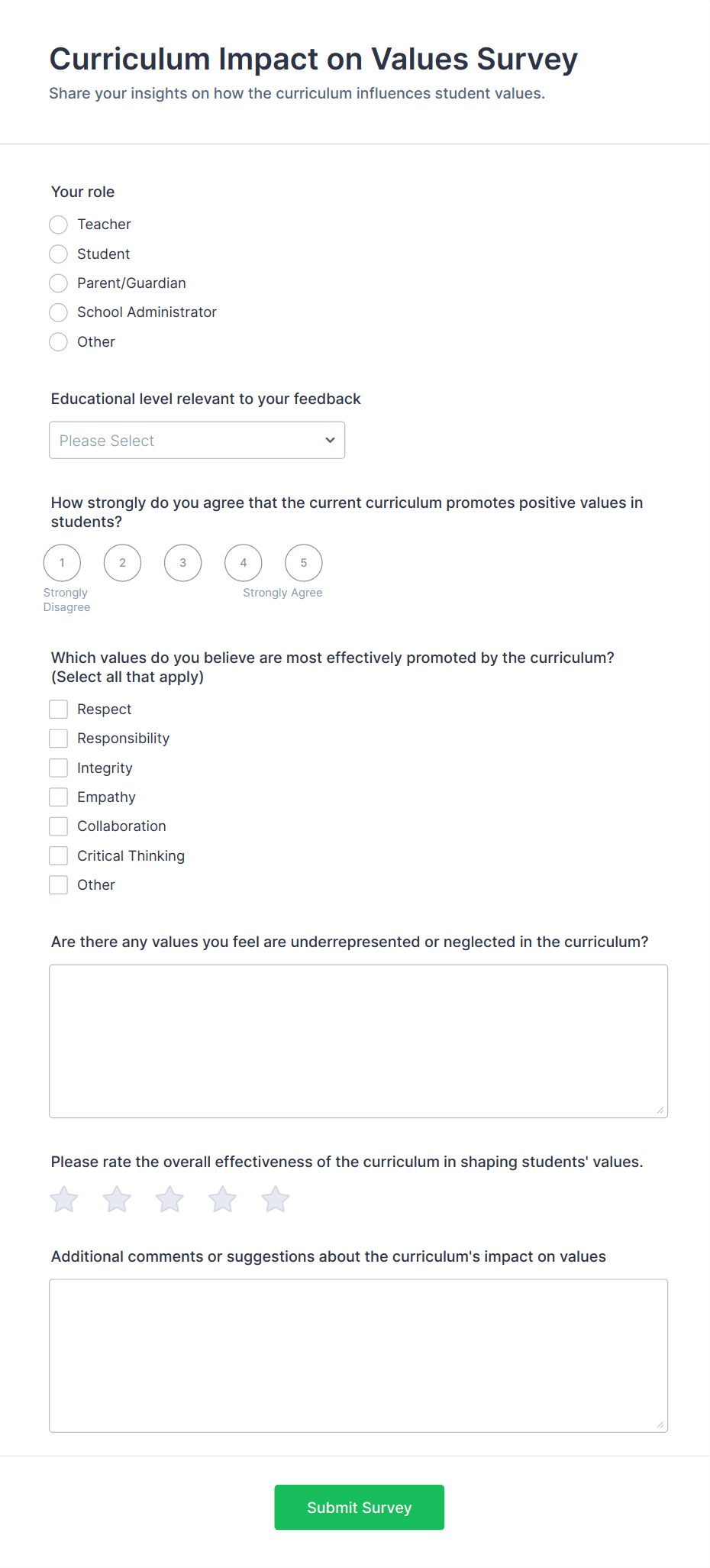 • For teacher or staff surveys: Include self-assessment fields, peer review sections, and narrative response options.