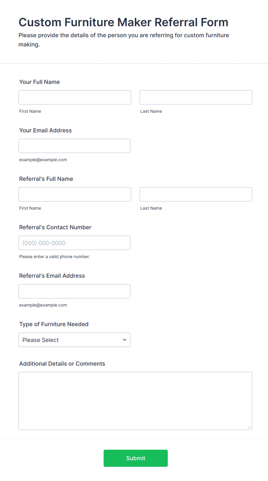 Referral forms are essential tools used to collect and manage information when one party recommends a person, service, or business to another. These forms streamline the process of gathering key details about the referred individual or entity, the referrer, and the context of the referral. Common use cases include employee referral programs, patient referrals in healthcare, client referrals in legal or financial services, and customer referrals in sales and marketing. By standardizing the referral process, organizations can ensure that all necessary information is captured efficiently, reducing miscommunication and speeding up follow-up actions.