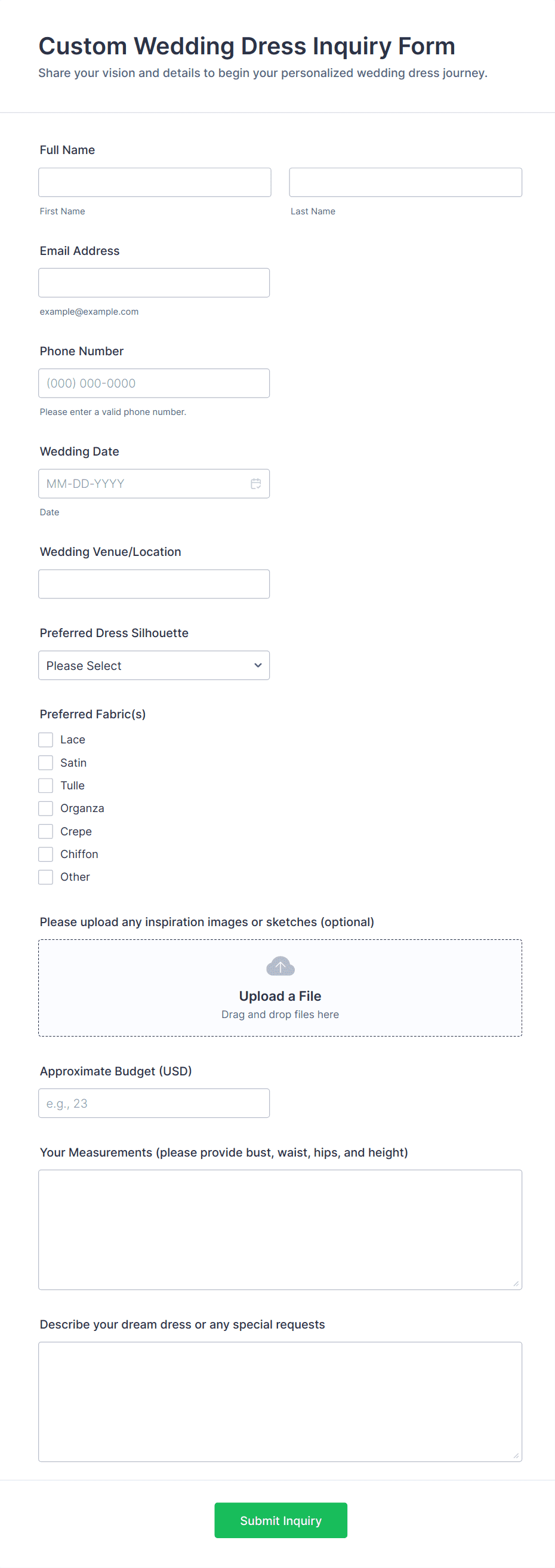 Wedding Forms are specialized digital forms designed to streamline and organize every aspect of wedding planning and management. These forms can be used for a variety of purposes, such as collecting RSVPs, managing guest lists, coordinating vendors, tracking budgets, gathering song requests, and even collecting feedback after the event. Whether you’re a couple planning your own wedding, a professional wedding planner, or a venue coordinator, Wedding Forms help ensure that all details are captured efficiently, reducing the risk of miscommunication and last-minute surprises. Their versatility makes them suitable for both intimate gatherings and large-scale celebrations, covering everything from pre-wedding preparations to post-event follow-ups.