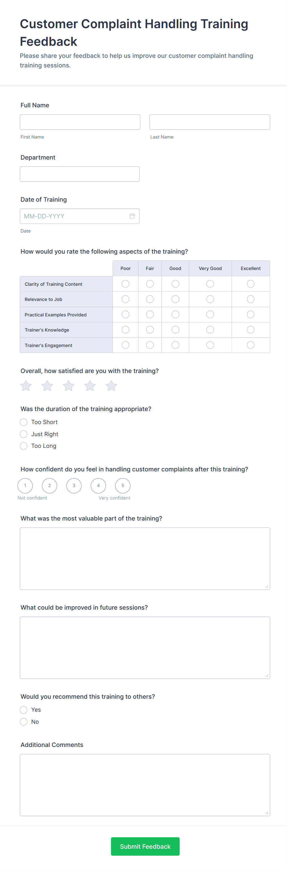 Collect training name, session date, trainer name, department, and participant role so results can be segmented.