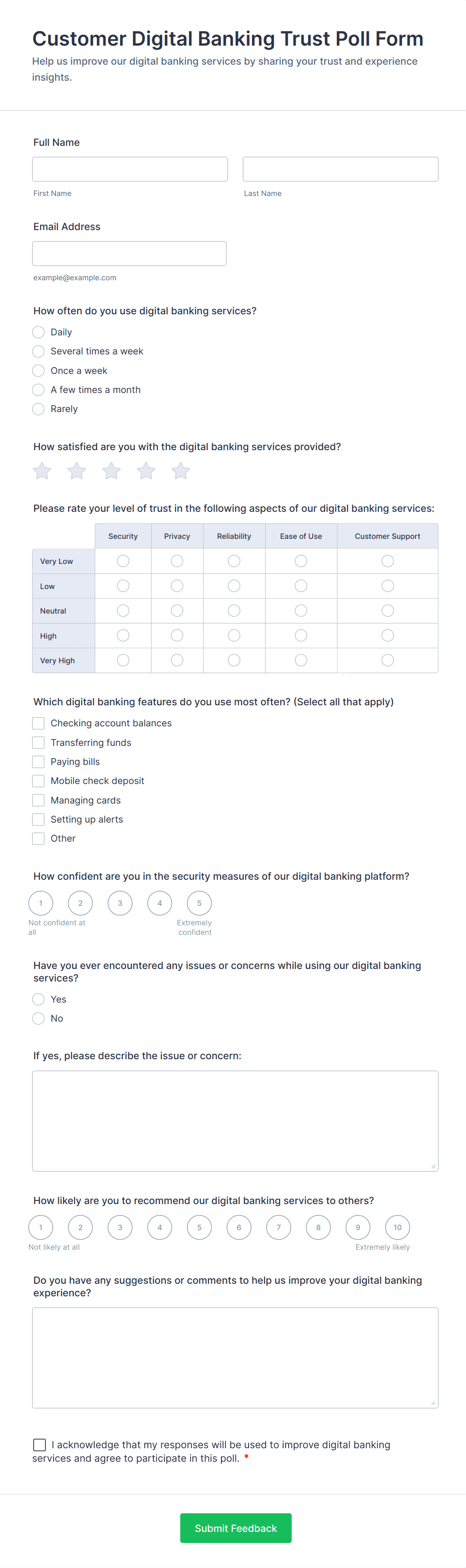 A banking form template is a pre-designed digital form used by financial institutions to collect, process, and manage information related to banking services, such as account openings, loan applications, and compliance checks.