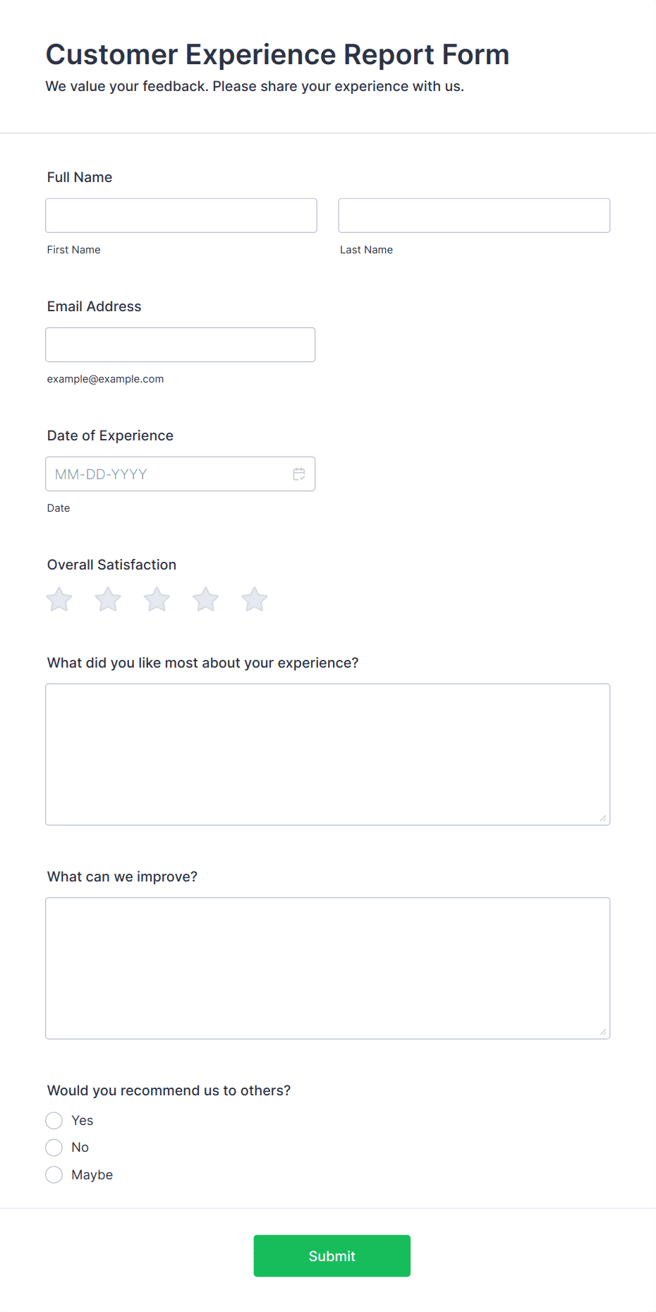 • Product feedback forms may include questions about usability, features, and likelihood to recommend.
