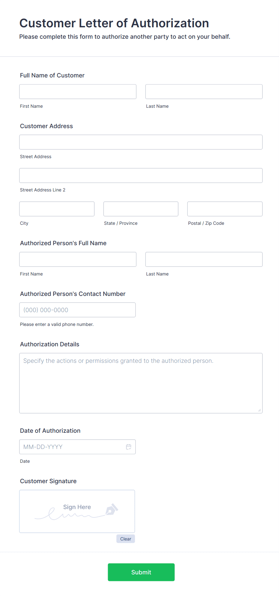 An authorization form is a document used to obtain formal consent or permission from an individual or organization to perform a specific action, such as releasing information, processing payments, or granting access.