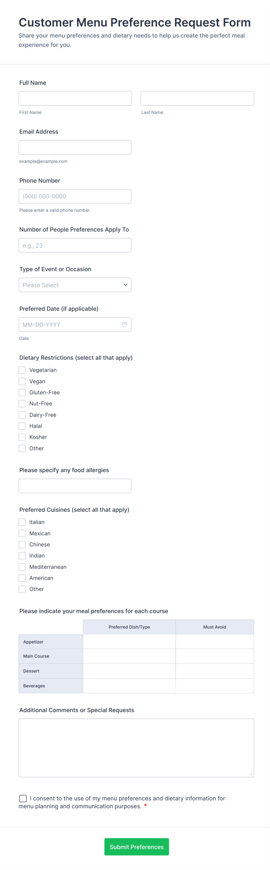• Event Catering Requests: Gather detailed information for catering events, such as guest count, menu preferences, dietary restrictions, and event logistics.