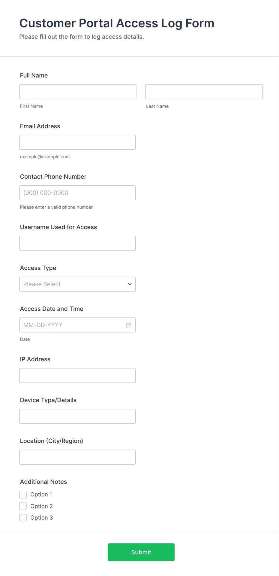 Collect requester name, department, contact info, and access type (physical, system, visitor). Include the reason for access and requested dates.