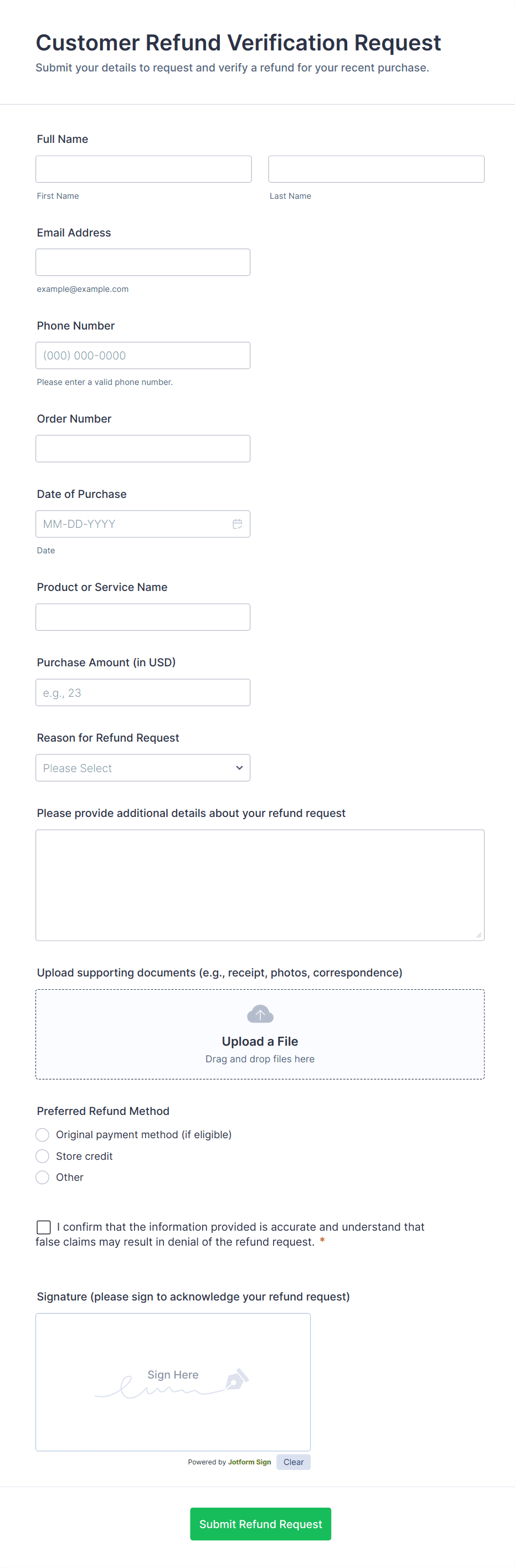 - E-commerce Refunds: May require order number, product details, reason for return, and upload fields for receipts or photos.