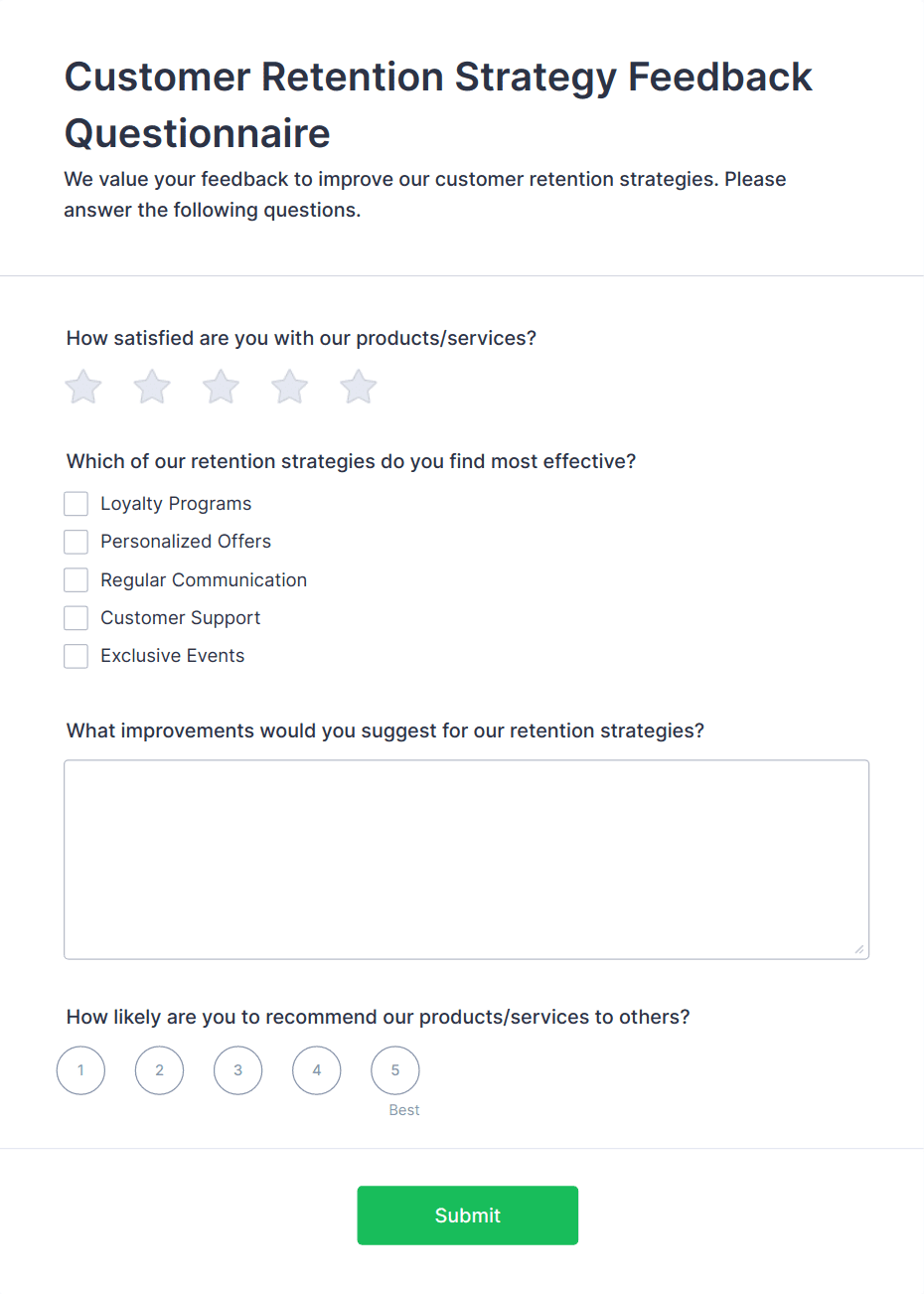 • Product feedback forms may include questions about usability, features, and likelihood to recommend.