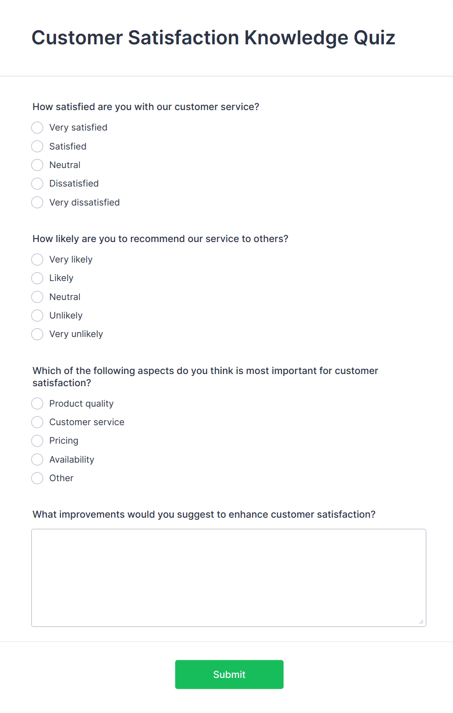 Get to know your customers with a free online Customer Satisfaction Survey. Easy to customize, share, and embed. Analyze results to improve your business.