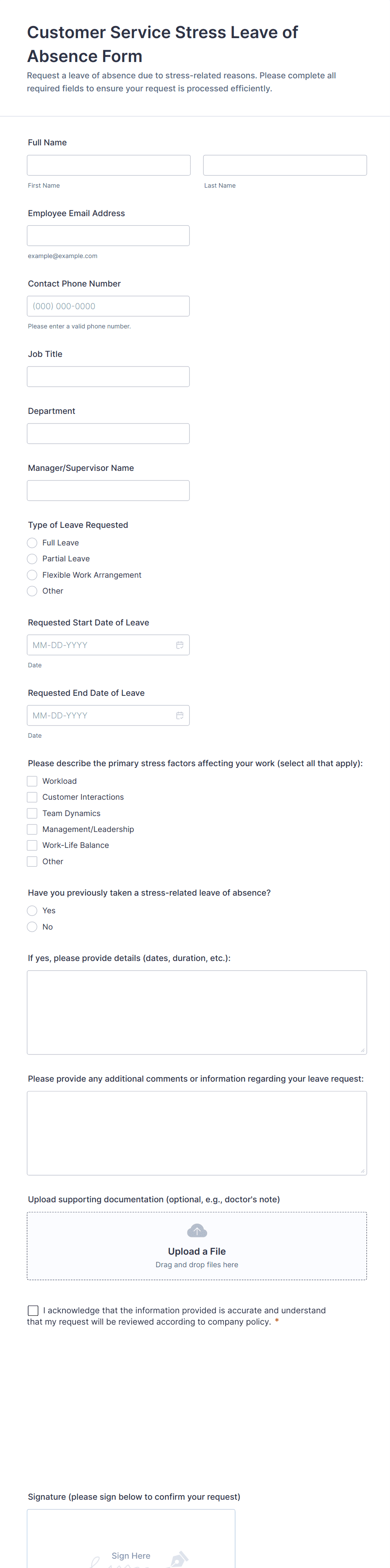 Common fields include employee name, department, type of leave, dates of absence, reason for leave, and any required supporting documentation.