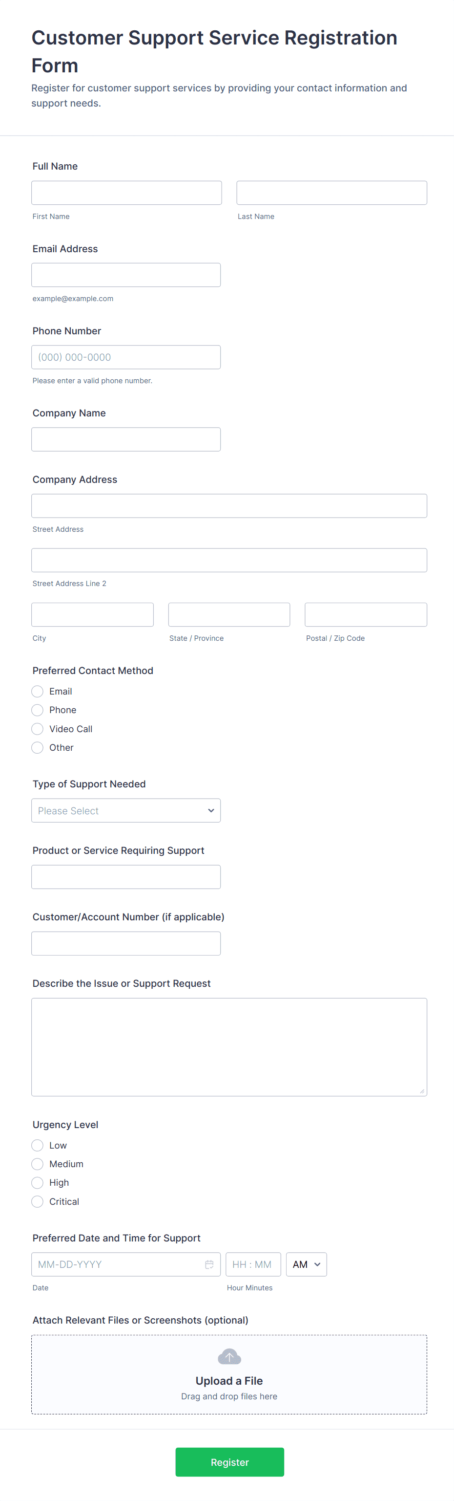 Typical fields include customer contact details, type of inquiry, detailed description, urgency level, and any supporting documents or screenshots.